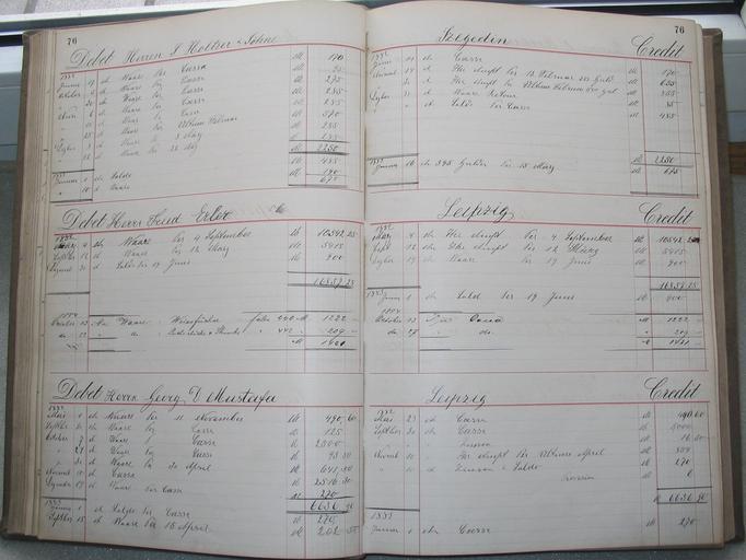 | Keywords: Ledger of the fur trader Dedo from Leipzig, 1876-1885 076.jpg Hauptbuch des Leipziger Rauchwarenhändlers Dedo 1986-1975 Herren S Holtzer Söhne Szegedin Herrn Fried Erler Leipzig Herrn Georg D Mustafa Leipzig 075 077 Collection Kuhn 2010-12-29 14 56 57 Dedo PD-old Ledger of the fur trader Dedo in Leipzig 1876-1885 Furriers and fur traders of Leipzig named in the accountancy of Naoum Dedo in Leipzig Holtzer Söhne Furriers in Szeged Mustafa Georg D Friedrich Erler Rauchwaren Leipzig | ||||