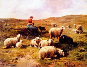 | Keywords: Leemputten shepherdess.jpg  A shepherdess with her flock grazing - oil on canvas 41 x 56 5 cm repro from art book Cornelis van Leemputten 1841-1902 Author died more than 70 years ago - public domain PD-old Cornelis Van Leemputten Paintings of sheep Female shepherds in art |