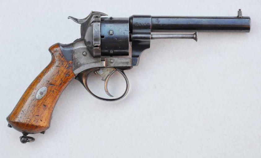 Keywords: Lef6.jpg en Norsk selvspent Lefaucheux revolver M/1864 for offiserer rundt løp own Kvm1914 Cc-zero Lefaucheux revolver