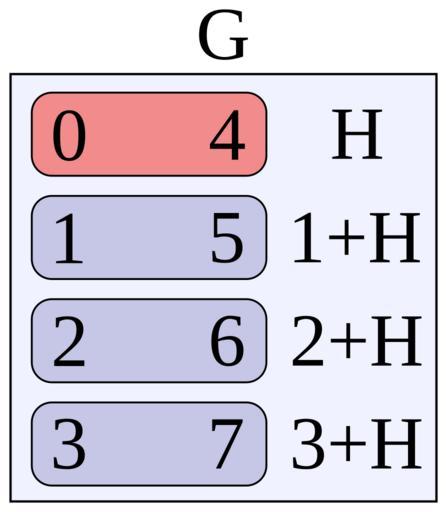 | Keywords: Left cosets of Z 2 in Z 8.svg en Diagram demonstrating cosets Here G is the set <math>\mathbb Z _8</math> the integers mod 8 under addition The subgroup H contains only 0 and 4 and is isomorphic to <math>\mathbb Z _2</math> There are four cosets of H H itself 1+H 2+H 3+H written using additive notation since this is an additive group Together they partition the entire group G into equal-size non-overlapping sets Produced in Inkscape own User Dcoetzee 2013-03-27 Cyclic groups Cc-zero | ||||
