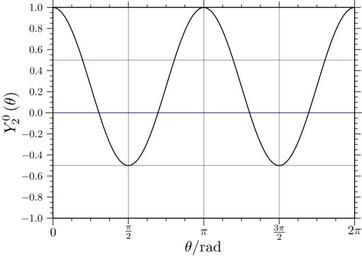 | Keywords: Legendre(2,0) Cos(th).svg Legendre Polynomial of cos with l 2 m 0 Own Inkscape 2007-05-24 Legendre Polynomial of cos with l 2 m 0 - Equation <math>Y_0 2 \left \theta \right \frac 1 2 \left 3 \cos 2 \left \theta \right - 1 \right </math> - Co-ordinate System Cartesian - X Range 0 2 - Y Range -1 1 - 2 - colspan 2 Points of Interest in this Range - Maxima <math>\left 0 1 \right \ </math> <math>\left \pi 1 \right \ </math> <math>\left 2\pi 1 \right \ </math> - Minima <math>\left \frac \pi 2 -\frac 1 2 \right </math> <math>\left \frac 3\pi 2 -\frac 1 2 \right </math> - Roots <math>\cos \theta \pm \frac 1 \sqrt 3 </math> Spherical harmonics |