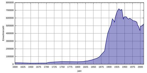 | Keywords: Leipzig population.svg  en Leipzig population statistics since 1600 de Einwohnerentwicklung von Leipzig seit 1600 own ; data from de Einwohnerentwicklung_von_Leipzig Gorgo 2011-03-06 Gnuplot script to generate this plot gnuplot <source lang gnuplot > /usr/bin/gnuplot gnuplot 4 2 / Ubuntu 8 10 input set timefmt d m Y set datafile separator ; output unset key set style data lines set style fill transparent solid 0 4 set grid set xdata time set xlabel 'Jahr' set xrange '01 01 1600' '31 12 2012' set xtics 788400000 set mxtics 5 set format x ' Y' set ylabel 'Einwohnerzahl' set ytics 100000 set format y ' 0f' set term svg size 800 400 font Arial 10 set output 'leipzig_population svg' plot '-' using 1 2 with filledcurves below x1 lt rgb 'dark-blue' lw 2 30 06 1165;500 30 06 1466;6000 30 06 1507;9000 30 06 1554;7883 30 06 1600;20000 30 06 1637;16000 30 06 1648;14000 30 06 1699;15653 30 06 1709;24832 30 06 1727;30000 30 06 1750;35000 30 06 1800;32146 30 06 1819;36093 30 06 1825;41506 03 07 1832;43189 03 12 1834;46294 03 12 1843;54519 03 12 1849;62374 03 12 1852;66686 03 12 1855;69746 03 12 1858;74209 03 12 1861;78495 03 12 1864;85394 03 12 1867;90824 01 12 1871;106925 01 12 1875;127387 01 12 1880;149081 01 12 1885;170340 01 12 1890;295025 02 12 1895;399963 01 12 1900;456124 01 12 1905;502570 01 12 1910;589850 01 12 1916;557868 05 12 1917;542845 08 10 1919;604380 31 12 1920;620000 16 06 1925;679159 31 12 1930;718200 16 06 1933;713470 31 12 1933;712768 31 12 1934;705782 31 12 1935;699300 31 12 1936;697846 31 12 1937;698590 31 12 1938;709800 17 05 1939;707365 31 12 1940;709100 01 12 1945;581528 29 10 1946;607655 31 08 1950;617574 31 12 1955;613707 31 12 1956;607523 31 12 1957;598909 31 12 1958;593902 31 12 1959;592821 31 12 1960;589632 31 12 1961;585258 31 12 1962;587226 31 12 1963;588135 31 12 1964;594882 31 12 1965;595660 31 12 1966;594099 31 12 1967;591538 31 12 1968;589064 31 12 1969;585803 31 12 1970;583885 31 12 1971;580711 31 12 1972;577495 31 12 1973;574432 31 12 1974;570972 31 12 1975;566630 31 12 1976;564596 31 12 1977;564306 31 12 1978;563980 31 12 1979;563225 31 12 1980;562480 31 12 1981;559574 31 12 1982;557923 31 12 1983;558994 31 12 1984;555764 31 12 1985;553560 31 12 1986;550641 31 12 1987;549230 31 12 1988;545307 31 12 1989;530010 31 12 1990;511079 31 12 1991;503191 31 12 1992;496647 31 12 1993;490851 31 12 1994;481121 31 12 1995;470778 31 12 1996;457173 31 12 1997;446491 31 12 1998;437101 31 12 1999;489532 31 12 2000;493208 31 12 2001;493052 31 12 2002;494795 31 12 2003;497531 31 12 2004;498491 31 12 2005;502651 31 12 2006;506578 31 12 2007;510512 31 12 2008;515469 31 12 2009;518862 31 12 2010;522883 31 12 2011;531809 31 12 2012;542117 e </source> Cc-zero Temporal population graphs of Saxony History of Leipzig Images with Gnuplot source code Population diagrams in German Demography by city Leipzig |