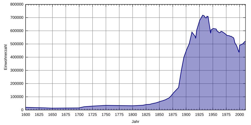 Keywords: Leipzig population.svg en Leipzig population statistics since 1600 de Einwohnerentwicklung von Leipzig seit 1600 own ; data from de Einwohnerentwicklung_von_Leipzig Gorgo 2011-03-06 Gnuplot script to generate this plot gnuplot <source lang gnuplot > /usr/bin/gnuplot gnuplot 4 2 / Ubuntu 8 10 input set timefmt d m Y set datafile separator ; output unset key set style data lines set style fill transparent solid 0 4 set grid set xdata time set xlabel 'Jahr' set xrange '01 01 1600' '31 12 2012' set xtics 788400000 set mxtics 5 set format x ' Y' set ylabel 'Einwohnerzahl' set ytics 100000 set format y ' 0f' set term svg size 800 400 font Arial 10 set output 'leipzig_population svg' plot '-' using 1 2 with filledcurves below x1 lt rgb 'dark-blue' lw 2 30 06 1165;500 30 06 1466;6000 30 06 1507;9000 30 06 1554;7883 30 06 1600;20000 30 06 1637;16000 30 06 1648;14000 30 06 1699;15653 30 06 1709;24832 30 06 1727;30000 30 06 1750;35000 30 06 1800;32146 30 06 1819;36093 30 06 1825;41506 03 07 1832;43189 03 12 1834;46294 03 12 1843;54519 03 12 1849;62374 03 12 1852;66686 03 12 1855;69746 03 12 1858;74209 03 12 1861;78495 03 12 1864;85394 03 12 1867;90824 01 12 1871;106925 01 12 1875;127387 01 12 1880;149081 01 12 1885;170340 01 12 1890;295025 02 12 1895;399963 01 12 1900;456124 01 12 1905;502570 01 12 1910;589850 01 12 1916;557868 05 12 1917;542845 08 10 1919;604380 31 12 1920;620000 16 06 1925;679159 31 12 1930;718200 16 06 1933;713470 31 12 1933;712768 31 12 1934;705782 31 12 1935;699300 31 12 1936;697846 31 12 1937;698590 31 12 1938;709800 17 05 1939;707365 31 12 1940;709100 01 12 1945;581528 29 10 1946;607655 31 08 1950;617574 31 12 1955;613707 31 12 1956;607523 31 12 1957;598909 31 12 1958;593902 31 12 1959;592821 31 12 1960;589632 31 12 1961;585258 31 12 1962;587226 31 12 1963;588135 31 12 1964;594882 31 12 1965;595660 31 12 1966;594099 31 12 1967;591538 31 12 1968;589064 31 12 1969;585803 31 12 1970;583885 31 12 1971;580711 31 12 1972;577495 31 12 1973;574432 31 12 1974;570972 31 12 1975;566630 31 12 1976;564596 31 12 1977;564306 31 12 1978;563980 31 12 1979;563225 31 12 1980;562480 31 12 1981;559574 31 12 1982;557923 31 12 1983;558994 31 12 1984;555764 31 12 1985;553560 31 12 1986;550641 31 12 1987;549230 31 12 1988;545307 31 12 1989;530010 31 12 1990;511079 31 12 1991;503191 31 12 1992;496647 31 12 1993;490851 31 12 1994;481121 31 12 1995;470778 31 12 1996;457173 31 12 1997;446491 31 12 1998;437101 31 12 1999;489532 31 12 2000;493208 31 12 2001;493052 31 12 2002;494795 31 12 2003;497531 31 12 2004;498491 31 12 2005;502651 31 12 2006;506578 31 12 2007;510512 31 12 2008;515469 31 12 2009;518862 31 12 2010;522883 31 12 2011;531809 31 12 2012;542117 e </source> Cc-zero Temporal population graphs of Saxony History of Leipzig Images with Gnuplot source code Population diagrams in German Demography by city Leipzig |
