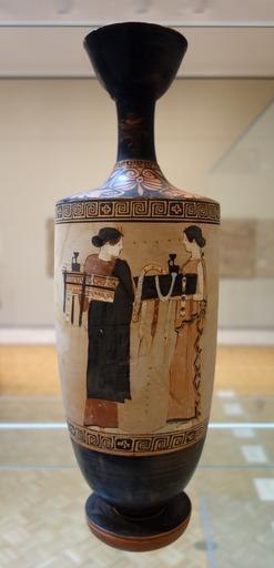 Keywords: Lekythos with women going to cemetery, view 1, near the Timokrates Painter, Greek, Attica, c. 460 BC, ceramic, red figure decoration on white ground - Chazen Museum of Art - DSC02692.JPG en Exhibit in the Chazen Museum of Art University of Wisconsin-Madison Madison Wisconsin USA This artwork is old enough so that it is in the public domain Photography was permitted in the museum without restriction 2013-07-21 14 33 41 own Daderot cc-zero Ancient Greek pottery in the Chazen Museum of Art Uploaded with UploadWizard White-ground lekythoi |