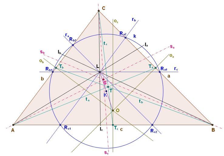 | Keywords: Lemoine Circle.jpg en Lemione circle ΔABC a b c sides t<sub>a</sub> t<sub>b</sub> t<sub>c</sub> medians T<sub>a</sub> T<sub>b</sub> T<sub>c</sub> midpoints T centroid s<sub>a</sub> s<sub>b</sub> s<sub>c</sub> angle bisectors S intersection of the angle bisectors incenter l<sub>a</sub> l<sub>b</sub> l<sub>c</sub> symmedians L intersection of the symmedians Lemoine point o<sub>a</sub> o<sub>b</sub> o<sub>c</sub> perpendicular bisectors O intersection of the perpendicular bisectors circumcenter K center of LO line segment Lemoine circle center k Lemoine circle r<sub>a</sub> r<sub>b</sub> r<sub>c</sub> parallels with sides including Lemoine point R<sub>a1</sub> R<sub>a2</sub> R<sub>b1</sub> R<sub>b2</sub> R<sub>c1</sub> R<sub>c2</sub> intersections of sides and ra rb rc parallels all points lie at Lemoine circle cs Lemoinova kružnice ΔABC a b c strany t<sub>a</sub> t<sub>b</sub> t<sub>c</sub> těžnice T<sub>a</sub> T<sub>b</sub> T<sub>c</sub> paty těžnic T - těžiště s<sub>a</sub> s<sub>b</sub> s<sub>c</sub> osy úhlů S průsečík os úhlů střed kružnice vepsané l<sub>a</sub> l<sub>b</sub> l<sub>c</sub> symediány L průsečík symedián Lemoinův bod o<sub>a</sub> o<sub>b</sub> o<sub>c</sub> - osy stran O průsečík os stran střed kružnice opsané K střed úsečky LO střed Lemoinovy kružnice k Lemoinova kružnice r<sub>a</sub> r<sub>b</sub> r<sub>c</sub> rovnoběžky se stranami vedené Lemoinovým bodem R<sub>a1</sub> R<sub>a2</sub> R<sub>b1</sub> R<sub>b2</sub> R<sub>c1</sub> R<sub>c2</sub> průsečíky stran a rovnoběžek r<sub>a</sub> r<sub>b</sub> r<sub>c</sub> všechny leží na Lemoinově kružnici own Lukas Sova 2009-03-23 math Lemoine circles Centroid Incenter |
