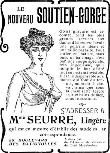 | Keywords: LeNouveauSoutienGorge1906Femina.png  The New Bra shown here provides a the greatest service to the ladies who want to have perfect breasts and a perfect figure Entirely in linen without busk or boning it is a special cut very cleverly achieving the desired goal while remaining invisible It is essential for the ladies who play tennis ride horseback under a light blouse and at the seaside under the costume CONTACT Mrs SEURRE lingerie mistress who is able to make custom outfits 55 Boulevard des Batignolles close to the Avenue de Villiers and the Boulevard Malesherbes FEMINA 15 Octobre 1906 page XIII 1906 company advertisement Image LeNouveauSoutienGorge1906 png PD-old History_of_brassieres Fashion in 1906 |