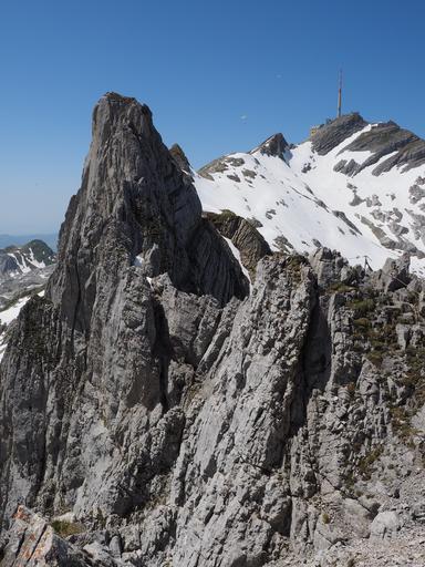 Keywords: lenses ridge climbing scramble rope the rope säntis mountain alpine snow swiss alps appenzell mountain station transmission tower alpstein alpstein region transmitter säntis reinforced concrete swisscom broadcast mountain summit mountain peak summit great wire rope