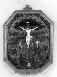 Keywords: Léonard Limosin II - The Crucifixion - Walters 44136.jpg The tall cross is set off against a sky overcast with somber clouds From them and from a black aperture at the top shoot bolts and shafts of light At the horizon is a blue ridge of hills below which are clustered the buildings of Jerusalem trees and a stream Beside the cross the Virgin bows her head and clasps her hands St John lifts his two hands in mourning and adoration A skull and a bone lie at the foot of the cross In the grass at the lower left is the signature L L the two letters are separated by a fleur-de-lys early Other date century 17 technique painted enamel copper cm 13 5 10 1 accession number 44 136 23700 William T / Henry Walters Collection Baltimore date and mode of acquisition unknown Walters Art Museum Henry Walters Acquired by William T or Henry Walters place of origin Limoges France Walters Art Museum license Limoges painted enamels in the Walters Art Museum Media contributed by the Walters Art Museum needs category review Painted enamel art in the Walters Art Museum Léonard Limosin II |