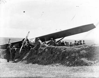 | Keywords: leonardo da vinci leonardodavinci nr 13137 nr13137 bellanca pacemaker bellancapacemaker 300hp wright j-6 whirlwind 300hpwrightj6whirlwind forced landing forcedlanding moy lahinch clare ireland george r. pond georgerpond cesare sabelli cesaresabelli transatlantic flight transatlanticflight aviation flying propellor ditch bystanders may 1934 1930s thirties independent newspapers collection independentnewspaperscollection aircraft airplane c/n 3006 cn3006 bellanca aircraft company bellancaaircraftcompany bellanca aircraft bellancaaircraft bellanca j-300 pacemaker bellancaj300pacemaker bellanca j-300 bellancaj300 j-300 j300 pacemaker j-300 pacemaker j300pacemaker wright j-6 whirlwind wrightj6whirlwind wright j-6 wrightj6 wright whirlwind wrightwhirlwind aviator aviators sabelli george pond georgepond pond connaught connacht national library of ireland nationallibraryofireland blackandwhite monochrome outdoor vehicle black and white This is the Leonardo da Vinci, aka NR 13137, resting comfortably after an emergency landing near Lahinch, Co. Clare, and captured by an Irish Independent photographer. This was part of the account in the newspaper: "The two American airmen, Capt. George Pond and Lieut. Sabelli, who left New York at noon on Monday (Irish time) in an endeavour to make a non-stop flight to Rome, were forced down on the Co. Clare coast last night. The flyers, who had been 32½ hours in the air, walked into Lahinch almost unobserved and, going to the Commercial Hotel there, booked rooms and went off to bed. Their machine, the Leonardo da Vinci, was forced down at about 8.30 p.m. at a little place called Moy, making a good landing in a small field. It appeared that some trouble with their petrol tank was the primary cause of their descent, and in the landing some slight injury was caused to the machine. The flyers were overdue when they reached the coast of Ireland, but this was accounted for by the fact that on the greater part of their journey they encountered severe fog, and had to fly blind most of the way." By the way, George R. Pond was a member of the family behind Pond's Cosmetics. Date: 16 May 1934 NLI Ref.: INDH2844 This is the Leonardo da Vinci, aka NR 13137, resting comfortably after an emergency landing near Lahinch, Co. Clare, and captured by an Irish Independent photographer. This was part of the account in the newspaper: "The two American airmen, Capt. George Pond and Lieut. Sabelli, who left New York at noon on Monday (Irish time) in an endeavour to make a non-stop flight to Rome, were forced down on the Co. Clare coast last night. The flyers, who had been 32½ hours in the air, walked into Lahinch almost unobserved and, going to the Commercial Hotel there, booked rooms and went off to bed. Their machine, the Leonardo da Vinci, was forced down at about 8.30 p.m. at a little place called Moy, making a good landing in a small field. It appeared that some trouble with their petrol tank was the primary cause of their descent, and in the landing some slight injury was caused to the machine. The flyers were overdue when they reached the coast of Ireland, but this was accounted for by the fact that on the greater part of their journey they encountered severe fog, and had to fly blind most of the way." By the way, George R. Pond was a member of the family behind Pond's Cosmetics. Date: 16 May 1934 NLI Ref.: INDH2844 |