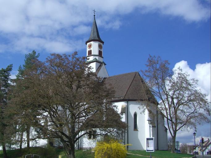 Keywords: leonhard church church leonhard langenau building architecture steeple spring sky blue clouds