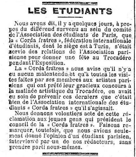 | Keywords: Les étudiants - La Presse - 8 novembre 1900 - page 3, 1ère colonne.jpg fr Article sur une fête donnée à Paris en 1900 par la Corda Fratres La Presse 8 novembre 1900 page 3 1ère colonne http //gallica bnf fr/ark /12148/bpt6k5496883/f3 image r langFR La Presse anonymous 1900-11-08 Domaine public 1900 La Presse Paris Corda Fratres PD-old |