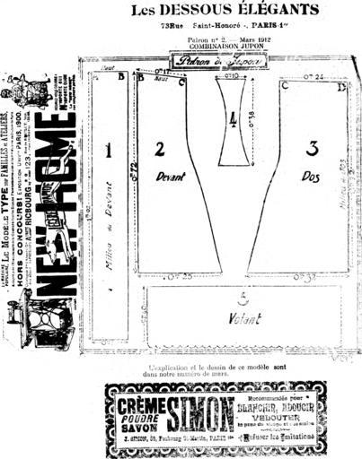| Keywords: LesDessousElegantsMars1912.png Les Dessous Elegants; month Mars March ; year 1912 <p>Pattern for a Combinaison-Jupon combination-petticoat; i e a slip <ul> <li>Part 1 center front <li>Part 2 front <li>Part 3 back <li>Part 4 not labeled - possibly shoulder strap <li>Part 5 ruffle </ul> Les Dessous Élégants - Mars 1912 PD-Art Sewing patterns Women's underwear Fashion in 1912 Dessous Elegants 1912 Artworks missing infobox template | ||||