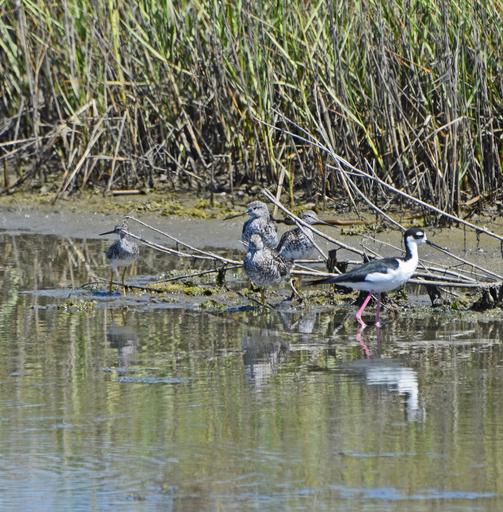 Keywords: outdoor bird animal aquatic bird 3 Greater Yellowlegs - center; Black-necked Stilt - right 3 Greater Yellowlegs - center; Black-necked Stilt - right