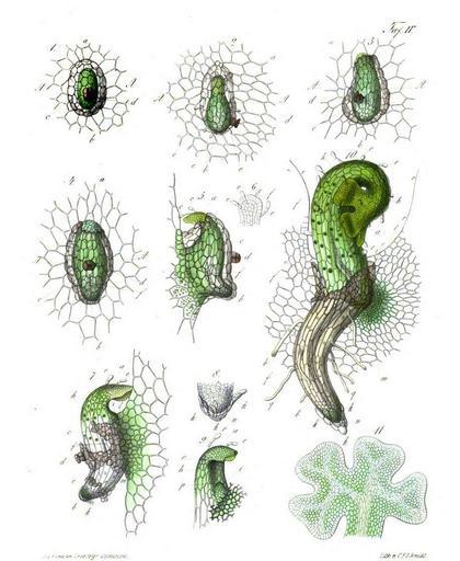 | Keywords: Leszczyc-Sumiński 3.PNG Pteris fern frond From 1848 treatise by Polish botanist Michał Hieronim Leszczyc-Sumiński pl Ilustracja z rozprawy Leszczyc-Sumińskiego Tablica IV 1 Wydłużony zarodek - A A widziany z góry a - zalążek pierwszego listka b - zalążek pierwszego bocznego korzonka c - woreczek zalążkowy d - zamarła szyjka rodni 2 To samo u Polypodium aureum w stadium większego rozwoju e e - włoski 3 To samo po przebicu się listka a 4 Zarodek wykazujący pierwsze założenia naczyń spiralnych f - listek a zgina się hakowato w kierunku przedrośla 5 To samo z boku e e - włoski cżłonowate 6 Pierwszy listek izolowany f - pierwsze założenia systemu naczyń spiralnych g - komórki brzeżne 7 Boczny wygląd zarodka po przebiciu się listka a i korzonka b c c - resztki jamy brzusznej h - ogonek liściowy i - szczyt łodygi k - czepeczek korzeniowy l m - podstawa zarodka 8 Izolowany szczyt korzonka k k k - czepeczek korzeniowy n - przeźroczysta warstwa miazgi cambium 9 Koniec liscia roślinki oddzielony od przedrośla i skręcony uwidacznia rynienkę ogonka liściowego o p i pąk szczytowy i 10 Cała roślinka z małym bocznym skrzywieniem widok z góry f f f - przechodzące przez roślinkę już dosyć rozwinięte naczynie a a - chwytniki r r r - wycięcie brzegu zatoka przedrośla 11 Rozwinięty pierwszy listek wskazuje na rozdział systemu naczyniowego na cztery łatki Tłumaczenie opisu tablic wg Hryniewiecki B Studia i Materiały do Dziejów Nauki Seria B 16 ss 55-57 1969 Zur Entwickelungs-Geschichte der Farrnkräuter Verlag der deckerschen geheimen Ober-Hofbuchdruckerei 1848 Retrieved from GoogleBooks cropped contrast enhanced dirt removed Michał Hieronim Leszczyc-Sumiński 1820-1898 1848 public domain due to its age PD-old Unidentified Pteris Pteridaceae botanical illustrations Michał Hieronim Leszczyc-Sumiński |