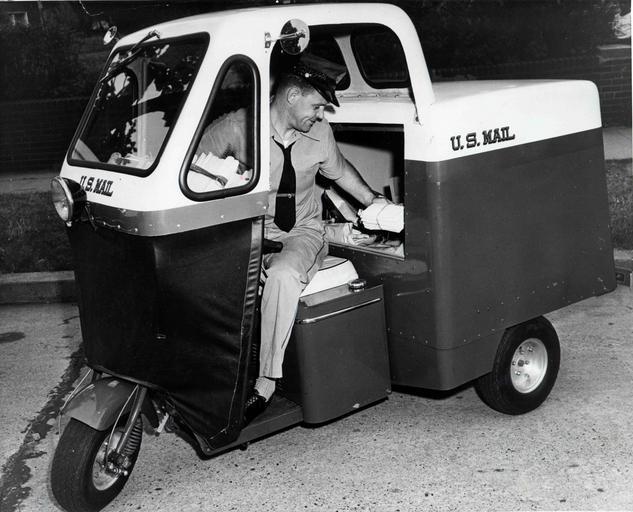 | Keywords: smithsonian institution smithsonianinstitution usps mailster three-wheel vehicle threewheelvehicle postal service postalservice post office postoffice lettercarrier u. s. mail usmail cushman cushman mailster cushmanmailster transportation postal history postalhistory three wheels threewheels postal delivery mid-20th century mid20thcentury working vehicle motor idolized tricycle idolizedtricycle national postal museum nationalpostalmuseum mail across the commons mailacrossthecommons dog toy dogtoy blackandwhite black and white Description: City letter carrier seated in a three-wheeled "mailster" motor vehicle. Carriers used these vehicles to carry the ever-increasing amounts of mail that was being delivered to American households after end of the Second World War. The mailster worked best in temperate climates or on even terrain. In other areas, they sometimes did not work at all. Northern carriers, immobilized in as little as three inches of snow, also complained of the vehicles' inability to heat properly. The three-wheel design left mailsters susceptible to tipping over if cornering over 25 miles per hour or if caught in a wind gust. One carrier complained that his mailster was tipped over by a large dog. Creator/Photographer: Unidentified photographer Medium: Black and white photographic print Culture: American Geography: USA Date: 1955 Collection: U.S. Mail Trucks Repository: National Postal Museum Accession number: A.2008-32 Persistent URL: arago.si.edu/index.asp?con=2&cmd=1&id=194384 View more collections from the Smithsonian Institution. Description: City letter carrier seated in a three-wheeled "mailster" motor vehicle. Carriers used these vehicles to carry the ever-increasing amounts of mail that was being delivered to American households after end of the Second World War. The mailster worked best in temperate climates or on even terrain. In other areas, they sometimes did not work at all. Northern carriers, immobilized in as little as three inches of snow, also complained of the vehicles' inability to heat properly. The three-wheel design left mailsters susceptible to tipping over if cornering over 25 miles per hour or if caught in a wind gust. One carrier complained that his mailster was tipped over by a large dog. Creator/Photographer: Unidentified photographer Medium: Black and white photographic print Culture: American Geography: USA Date: 1955 Collection: U.S. Mail Trucks Repository: National Postal Museum Accession number: A.2008-32 Persistent URL: arago.si.edu/index.asp?con=2&cmd=1&id=194384 View more collections from the Smithsonian Institution. |