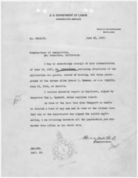 Keywords: Letter from Commissioner General of Immigration to Commissioner of Immigration, Angel Island Station, regarding enemy... - NARA - 296439.jpg Scope and content This document is from a case concerning German native Ernst Hamann who had the misfortune to arrive in the U S a few days after President Wilson's anti-enemy alien proclamation of April 6 1917 Hamann was interned on Angel Island in San Francisco Bay General notes 296439 Local identifier Department of Justice Immigration and Naturalization Service San Francisco District Office - NARA's Pacific Region San Bruno NRHAS 1000 Commodore Drive San Bruno CA 94066-2350 1917-06-22 Record group Record Group 85 Records of the Immigration and Naturalization Service 1787 - 2004 Record group ARC 414 Case Files of Investigations Not Resulting in Warrant Proceedings in the San Francisco District and Investigations Within the San Francisco District at the Request of Other Service Offices compiled 1912 - 1944 Series ARC 296429 File unit Investigation Case File 12016/01106 -- Enemy Aliens 1916 - 1929 File unit ARC 296430 Variant control numbers NAIL Control Number NRHS-85-INSSF-HAMANN1106-9 Other versions <gallery> File Letter_from_Commissioner_General_of_Immigration_to_Commissioner_of_Immigration _Angel_Island_Station _regarding_enemy _-_NARA_-_296439 tif tif File Letter_from_Commissioner_General_of_Immigration_to_Commissioner_of_Immigration _Angel_Island_Station _regarding_enemy _-_NARA_-_296439 jpg jpg </gallery> NARA-cooperation PD-USGov 1917 German American history Internment in World War I Documents related to Angel Island Immigrants to the United States |