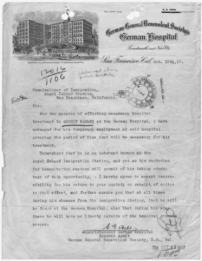 Keywords: Letter from German Hospital to Commissioner of Immigration, Angel Island Station, regarding enemy alien Ernst Hamann. - NARA - 296434.jpg Scope and content This document is from a case concerning German native Ernst Hamann who had the misfortune to arrive in the U S a few days after President Wilson's anti-enemy alien proclamation of April 6 1917 Hamann was interned on Angel Island in San Francisco Bay General notes 296434 Local identifier Department of Justice Immigration and Naturalization Service San Francisco District Office - NARA's Pacific Region San Bruno NRHAS 1000 Commodore Drive San Bruno CA 94066-2350 1917-10-12 Record group Record Group 85 Records of the Immigration and Naturalization Service 1787 - 2004 Record group ARC 414 Case Files of Investigations Not Resulting in Warrant Proceedings in the San Francisco District and Investigations Within the San Francisco District at the Request of Other Service Offices compiled 1912 - 1944 Series ARC 296429 File unit Investigation Case File 12016/01106 -- Enemy Aliens 1916 - 1929 File unit ARC 296430 Variant control numbers NAIL Control Number NRHS-85-INSSF-HAMANN1106-4 Other versions <gallery> File Letter_from_German_Hospital_to_Commissioner_of_Immigration _Angel_Island_Station _regarding_enemy_alien_Ernst_Hamann _-_NARA_-_296434 tif tif File Letter_from_German_Hospital_to_Commissioner_of_Immigration _Angel_Island_Station _regarding_enemy_alien_Ernst_Hamann _-_NARA_-_296434 jpg jpg </gallery> NARA-cooperation PD-USGov Documents related to Angel Island German American history Photographs of World War I Internment in World War I Immigrants to the United States 1917 texts 1917 in San Francisco Hospitals in San Francisco |