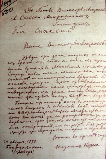 | Keywords: Letter from Kozma of Lesnovo to bishop Synesius of Skopje from Podrum Kale 14 August 1899.jpg Лесновския манасти Козма до мит ополит Синесий Скопски изп атено от затво а Под ум кале 14 август 1899 година en A Letter from Kozma of Lesnovo to the Bulgarian bishop Synesius of Skopje from Podrum Kale Prison 14 August 1899 mk Писмо од игуменот на Лесновскиот манасти Козма до скопскиот буга ски мит ополит упатено од затво от во Под ум кале 1899-08-14 Д жавен а хив на Република акедонија Kozma of Lesnovo PD-old other versions DARM file Supported by Shared Knowledge cc-by-sa-3 0 Uploaded with UploadWizard Kozma of Lesnovo Diocese of Skopje Letters of Bulgaria Kratovo |