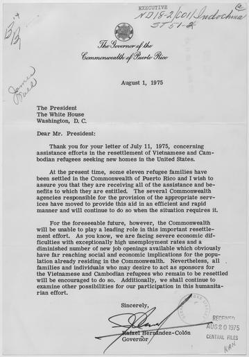 Keywords: Letter from Rafael Hernandez-Colon, Governor of the Commonwealth of Puerto Rico, to President Gerald R. Ford... - NARA - 186681.tif Scope and content General notes 186681 Local identifier President 1974-1977 Ford White House Office of Central Files 1974 - 1977 Institution Gerald R Ford Presidential Library Gerald R Ford Library NLGRF 1000 Beal Avenue Ann Arbor MI 48109-2114 1975-08-01 Record group Collection GRF-0056 White House Central Files Subject Files Ford Administration 08/09/1974 - 01/20/1977 Record group ARC 1130 White House Central Files Subject Files on National Security and Defense compiled 08/1974 - 01/1977 Series ARC 186672 File unit ND 18-2/CO 1 Refugees/Indochina 08/09/1974 - 01/20/1977 File unit ARC 186678 Variant control numbers NAIL Control Number NLF-0056-00001-04041-C yes Other versions Gerald R Ford Presidential Library and Museum-cooperation PD-USGov Refugees Gerald Ford |