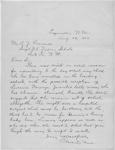 | Keywords: Letter to Superintendent concerning enrollment of students - NARA - 293300.tif Scope and content Letter to Supt Crandall from Mrs True stating that she would not admit any child who had been previously enrolled in a boarding school General notes 293300 Local identifier Department of the Interior Bureau of Indian Affairs Santa Fe Indian School Santa Clara Day School - NARA-Author True Clara D Author 8467825 <br /> New Mexico United States North and Central America state 4191641 35 -105 <br /> NARA's Rocky Mountain Region Denver NRGA Building 48 Denver Federal Center West 6th Avenue and Kipling Street Denver CO 80225-0307 1904-08-29 Record group Record Group 75 Records of the Bureau of Indian Affairs 1793 - 1999 Record group ARC 404 Letters Received from Day School Teacher Clara D True compiled 08/29/1902 - 09/17/1906 Series ARC 293139 File unit File unit ARC Variant control numbers NAIL Control Number NRG-75-E38-E19040829 yes Other versions NARA-cooperation PD-USGov Boarding schools in New Mexico Department of the Interior Office of Indian Affairs Native American schools |