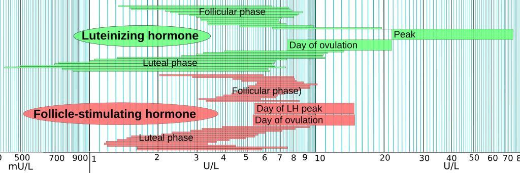 | Keywords: LH and FSH in menstrual cycle.svg  Reference ranges for luteinizing hormone and follicle-stimulating hormone throughout the menstrual cycle Detail from picture in en Reference ranges for blood tests The y-axis represent time throughout the menstrual cycle with one block corresponding to one day However progesterone and estrogen currently follow different y-axes Reference Values taken from day 1 after LH surge in http //www ncbi nlm nih gov/pubmed/16776638 Establishment of detailed reference values for luteinizing hormone follicle stimulating hormone estradiol and progesterone during different phases of the menstrual cycle on the Abbott ARCHITECT analyzer Reto Stricker Raphael Eberhart Marie-Christine Chevailler Frank A Quinn Paul Bischof and Rene´ Stricker Clin Chem Lab Med 2006;44 7 883 “887 PMID 16776638 Alternative link http //www dianalabs ch/documents/ajouts/Hormones pdf Own Mikael Häggström 2009-11-06 See also thumb left Estradiol and progesterone in menstrual cycle Blood values Follicle-stimulating hormone |