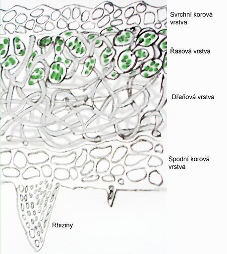 Keywords: Lichen cross-section.png Lichen thallus cross-section czech language self-made drawing based on the picture in LIŠKA Jiří Vázaný a nevázaný život lišejníků Vesmír November 2000 79 130 n 11 p 623-629 11 3 2008 Vojtech dostal public domain FR Lichen cross-section png Lichen anatomy and morphology |