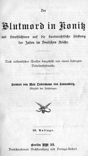 Keywords: Liebermann- Blutmord Konitz- 02-Titel.png Liebermann- Blutmord Konitz- 01-Lageplan Konitz png Liebermann- Blutmord Konitz- 03 png Eine Seite des Buches žDer Blutmord in Konitz A page of the book Der Blutmord in Konitz Buch Der Blutmord in Konitz Mit Streiflichtern auf die staatsrechtliche Stellung der Juden im Deutschen Reich Berlin 1901 <br />Scan des Originals aus der Stadtbücherei Elberfeld durch Wagusi Max Liebermann von Sonnenberg 1848 “1911 et al Original 1901<br />Scan 2008-12-16 PD-old Der Blutmord in Konitz |