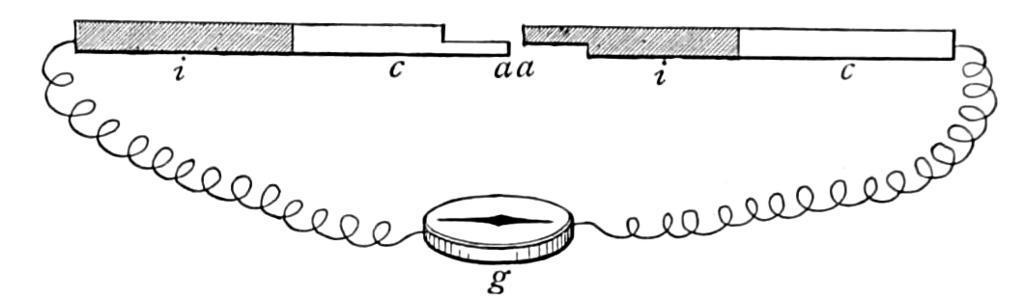Keywords: Life in Motion Fig 56.png en Fig 56 ” Thermal junctions of iron i and copper c g galvanometer; a a junctions that may be pressed together Life in Motion or Muscle and Nervehttps //archive org/details/b21929786 John Gray McKendrick 1892 1926 Life in Motion book Thermoelectricity |