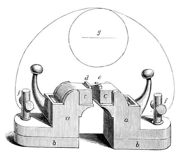 | Keywords: Life in Motion Fig 69.png en Fig 69 ”Arrangement of du Bois Reymond's troughs a a troughs of zinc; b vulcanite plates for insulation; c c paper pads; d e clay pads; f f connections for wires leading to galvanometer g Life in Motion or Muscle and Nervehttps //archive org/details/b21929786 John Gray McKendrick 1892 1926 Life in Motion book Biology experiments |