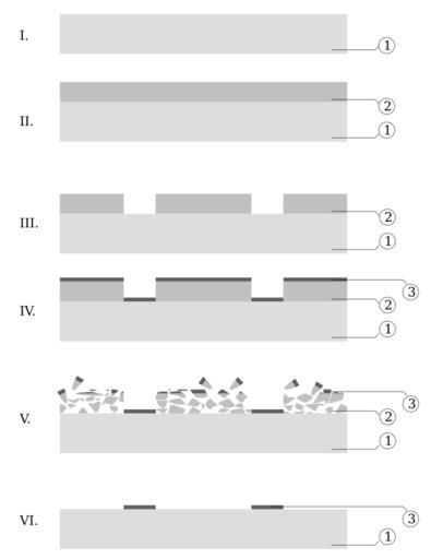 | Keywords: Lift-off (microtechnology) process.svg The image illustrates the Lift-off process used in microfabrication mostly to create metallic interconnects I Preparation of the substrate II Deposition of the sacrificial stencil layer III Patterning the sacrificial layer ex etching creating an inverse pattern IV Depostion of the target material V Washing out the sacrificial layer together with the target material on its surface VI Final pattern 1 Substrate 2 Sacrificial layer 3 Target material Own 07 04 2008 Twisp Semiconductor devices fabrication SVG microtechnology |