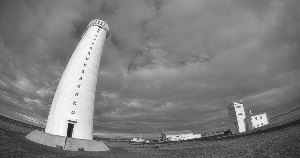 Keywords: lighthouse fisheye tower safety nature black white beacon light house building architecture iceland