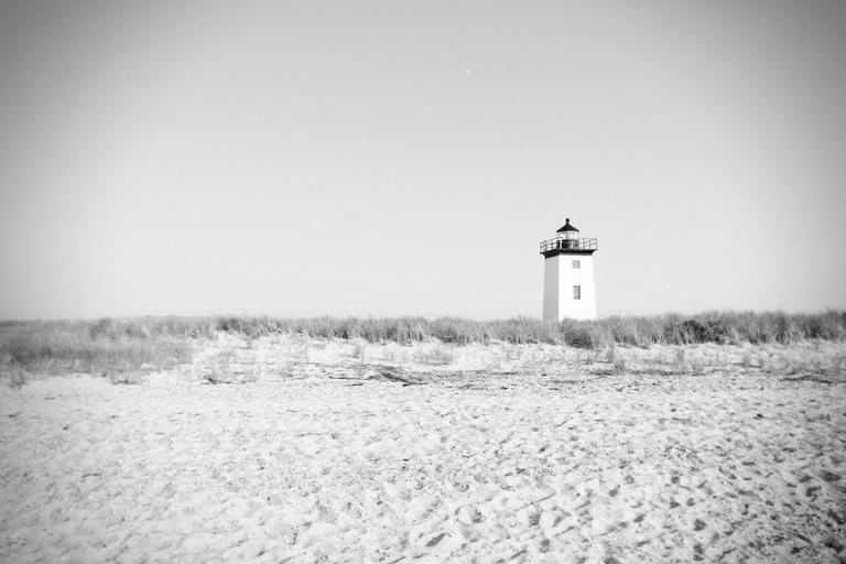 Keywords: lighthouse tower beacon light navigation coast landmark coastline beach shore island marine architecture seaside guidance nautical safety warning harbor sand bushes black and white