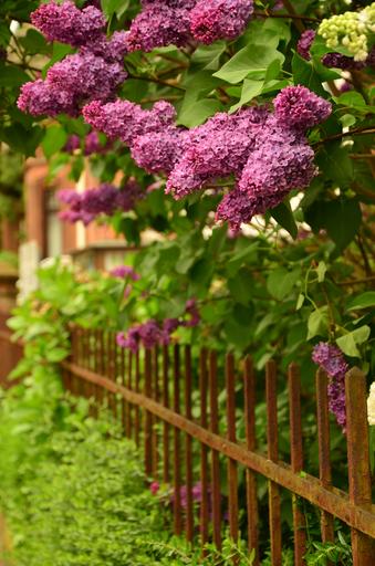Keywords: lilac fence flowers lilac tree iron garden rusted nature garden fence rusty purple green fenced