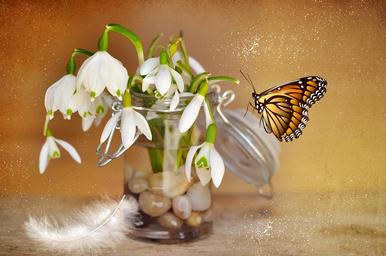 Keywords: lily of the valley snowdrop decorative glass glass stones vase jar flowers plant blossom bloom white deco decorative decoration butterfly spring painting digital painting