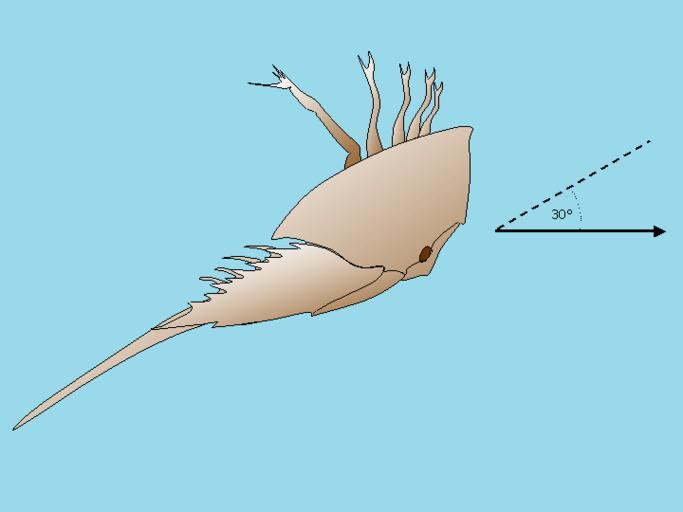 | Keywords: Limulus swimming.png  Scheme of a swimming Limulus Chelicerata Xiphosura or horseshoe crab Limulus normally swims upside down inclined at about 30° to the horizontal and moving at about 10-15 cm/s own 2010-03-30 Antonov Limulus polyphemus Xiphosura |