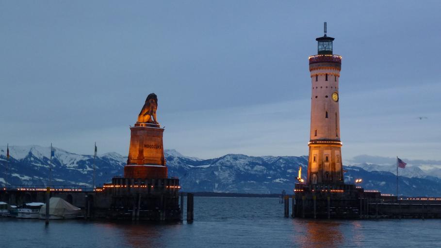 Keywords: lindau evening mood romantic lake constance idyllic harbour entrance lighthouse water bavaria germany illuminated