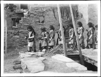 | Keywords: Line of eight antelope priests leaving the kiva at the Hopi Snake Dance ceremony, Arizona, ca.1898 (CHS-4656).jpg en <br> Line of eight antelope priests leaving the kiva at the Hopi Snake Dance ceremony Arizona ca 1898 Photograph of a line of eight antelope priests leaving the kiva at the Hopi Snake Dance ceremony Arizona ca 1898 They wear skirts with animal tails necklaces bracelets and feathers attached to their hair Each carries a small object in his hand A ladder descends into the open kiva in the foreground A few people spectate from the roof of one of the adobe dwellings in the background Call number CHS-4656 Legacy record ID chs-m16979; USC-1-1-1-13888 Photographer James George Wharton Filename CHS-4656 Coverage date circa 1898 Part of collection California Historical Society Collection 1860-1960 Type images Part of subcollection Title Insurance and Trust and C C Pierce Photography Collection 1860-1960 Repository name USC Libraries Special Collections Accession number 4656 Microfiche number 1-170- Archival file chs_Volume97/CHS-4656 tiff Repository address Doheny Memorial Library Los Angeles CA 90089-0189 Geographic subject country USA Format aacr2 3 photographs glass photonegative photoprints b w ; 22 x 17 cm 21 x 26 cm 17 x 21 cm Rights Digitally reproduced by the USC Digital Library; From the California Historical Society Collection at the University of Southern California Subject adlf tribal areas Project USC Repository email specol usc edu Identifying number unidentified no James-343 Contributing entity California Historical Society Date created circa 1898 Publisher of the digital version University of Southern California Libraries Format aat photographic prints; photographs Geographic subject state Arizona Subject file heading Indians -- Hopi -- Snake Dance Format glass plate negatives Access conditions Send requests to address or e-mail given Phone 213 821-2366; fax 213 740-2343 Geographic subject county Navajo Subject lcsh Indians of North America; Hopi Indians; Rites and ceremonies; Men Subject Hopi Indians circa 1898 date created George Wharton James 1858 1923 http //digitallibrary usc edu/cdm/ref/collection/p15799coll65/id/16898 PD-old-70-1923 Images from USC Digital Library uploaded by Fæ Photographs by George Wharton James California Historical Society Collection 1860-1960 Glass plate negatives Historical photographs of Navajo people Hopi men |