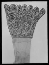 Keywords: Linnestrumpa, strövling - Livrustkammaren - 77190.tif Strumpa av tuskaftat linne trådtäthet 37x37 per cm2 Tillskuren i fyra delar två kragstycken ben och fot som är hopsydda med efterstygn Kragens övre kant avslutas med 14 flikar formade som bågar Formen påminner om reticella-spetsens bågformade kanter Den är fodrad med ett grövre linne som skyddar broderiets baksida Kragens höjd är 28 cm och dess övre omkrets 68 cm Broderade i svart silke och guldtråd huvudsakligen i stjälkstygn Motivet är lika på kragens båda sidor Huvudmotivet är ett ymnighetshorn med frukter som äpple päron och druvor Vid sidan av hornet en fågel Den återstående ytan täcks av slingrande blad och stjälkar samt blommor som tulpan ros och liljekonvalj På varje flik på kragen är en liten blomma broderad Motiven är dekorerade med guldtrådar lan på silkekärna som sytts i flätmönster Över sömmarna och kring den övre kanten ligger ett slätt guldband Broderiet överensstämmer med den engelska typen av broderi med svart tråd som man kan se på linneplagg från sent 1500-tal och tidigt 1600-tal Strumpans ben respektive fot är skurna på snedden för att ge bättre elasticitet och passform Benstycket har en liten triangulär skarvbit placerad vid mittbaksömmen uppe vid kragen Foten är skarvad framme vid tån Stockings or w Boothose en of linen 37x37 thread count per square cm Cut into four parts two cuffs legs and feet which are sewn with backstitch The upper edge of the cuff ends with 14 arch-shaped tabs The shape of the tabs is reminiscent of reticella needlelace -edgings The cuff is lined with a coarse linen that protects the back of the embroidery The cuff height is 28 cm and its upper circumference is 68 cm The cuffs are embroidered in black silk and gold wire primarily in stem stitch The motif is the same on both sides of the collar The main subject is a cornucopia with fruits incluidng apples pears and grapes At the side of the horn is a bird The remaining area is covered by meandering leaves and stems and flowers such as tulips roses and lily of the valley Each tab on the collar has a small embroidered flower The motifs are decorated with gold threads gold-wrapped silk core sewn in a cable pattern Over the seams and around the top edge is a plain gold band The embroidery is consistent with the English type of embroidery with black thread blackwork that can be seen on the linen garments from the late 1500s and early 1600s The sock and foot pieces are cut on the bias to provide better elasticity and fit The leg pice has a small triangular gusset from the middle of the back seam up to the cuff The foot is seamed in front of the toe original caption linnestrumpa strövl original caption linnestrumpa strövling - LRK 31124 Slaget vid Lützen 1632 size mm 630 häl-krage size mm 280 krage size mm 320 fot g 116 LRK Gustav II Adolf av Sverige Modelejon 2002 Jubileumsutst Lützen-Kapelle 2007 2007 place of origin original filename LN_A01459_001459 67690 inventory number LRK 31124 77190 CC0 Linnestrumpa strövling - Livrustkammaren - 77190-negative tif <gallery caption Different images of same object > File Linnestrumpa strövling - Livrustkammaren - 68631 tif File Linnestrumpa - Livrustkammaren - 25703 tif File Linnestrumpa buren av Gustav II Adolf i slaget vid Lützen - Livrustkammaren - 35185 tif File Linnestrumpa strövling - Livrustkammaren - 77191 tif File Linnestrumpa strövling - Livrustkammaren - 8705 tif File Linnestrumpa buren av Gustav II Adolf i slaget vid Lützen - Livrustkammaren - 43744 tif File Linnestrumpa strövling - Livrustkammaren - 146 tif File Linnestrumpa strövling - Livrustkammaren - 60069 tif File Linnestrumpa strövling - Livrustkammaren - 147 tif File Linnestrumpa buren av Gustav II Adolf i slaget vid Lützen - Livrustkammaren - 52304 tif File Linnestrumpa buren av Gustav II Adolf i slaget vid Lützen - Livrustkammaren - 26624 tif File Linnestrumpa strövling - Livrustkammaren - 17267 tif </gallery> < Clothes of Gustav II Adolf Stockings Linen clothing Blackwork embroidery 1630s fashion Embroidered clothing Media contributed by LSH dim-with multiple size templates Media contributed by LSH unmatched objKeyword Stockings in Livrustkammaren Media contributed by LSH 2013-10