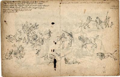 Keywords: Lion Hunt WDL11275.png Artwork ru Охота на львов fr La chasse au lion en Lion Hunt zh 猎狮 pt Caçada ao leão ar صيد الأسد ru П едставленные здесь живописные наб оски охоты на львов входят в коллекцию из 27 исунков на 15 листах обна уженных в 1986 г в ациональной библиотеке Южной Аф ики Ценность этих исунков заключается в том что они соде жат самые анние еалистичные изоб ажения п едставителей на одности кой-коин ко енных жителей Западно-Капской п овинции В п имечании на голландском языке в п авом ве хнем углу написано Львы уничтожают много скота но эти люди смело бо ются с ними В более длинном п имечании слева ечь идет об отношениях между кой-коин кото ые к тому в емени вели полуоседлый об аз жизни и бушменами или сан кочевым на одом сове шавшим набеги на домашний скот В аннеев опейских источниках можно найти большое количество инфо мации о кой-коин однако иллюст ации вст ечаются едко Входящие в коллекцию исунки были сделаны с нату ы и в отличие от большинства анних ев опейских изоб ажений п едставителей кой-коин никогда не инте п ети овались ев опейскими иллюст ато ами По всей ве оятности исунки выполнены одившимся в XVII веке голландцем кото ый по оду деятельности был связан с Голландской Ост-Индской компанией а возле ыса Доб ой адежды оказался по пути в Голландскую Ост-Индию или об атно в иде ланды Есть основания полагать что названные исунки были созданы не позднее 1713 г а быть может и го аздо аньше Большинство из них соде жат п имечания добавленные после 1730 г д угим человеком имя кото ого также остается неизвестным <br> ыс Доб ой адежды; Охота; Ко енные на одности; Кой-коин аф иканский на од ; Львы; Сан аф иканский на од fr Ces esquisses vives de la chasse au lion font partie d un ensemble de 27 dessins sur 15 feuilles qui a été découvert à la Bibliothèque nationale d Afrique du Sud en 1986 L importance des dessins réside dans l illustration des premières représentations réalistes des Khoïkhoï les premiers habitants du Cap-Occidental La note en néerlandais en haut à droite indique  « Les lions ravagent le bétail de ces gens mais ils les combattent avec bravoure » La note plus longue à gauche est relative aux relations entre les Khoï qui à cette époque ont adopté un mode de vie semi-sédentaire et les Bochimans ou les San qui étaient des nomades et qui s adonnaient aux razzias de bétail On trouve de nombreuses informations sur les Khoïkhoï dans les premiers récits européens mais il existe peu d illustrations Les dessins de la collection ont été réalisés <em>in situ</em> et contrairement à la plupart des premières représentations européennes des Khoïkhoï ils n'ont jamais été réinterprétés par les graveurs européens L artiste était fort probablement un Néerlandais né au XVIIe siècle qui occupait une certaine fonction à la Compagnie néerlandaise des Indes orientales Il se dirigeait vraisemblablement vers les Indes orientales néerlandaises ou rentrait aux Pays-Bas quand il a visité le Cap Des indications laissent à supposer que les dessins ont été réalisés au plus tard en 1713 et probablement même beaucoup plus tôt La plupart des dessins portent des annotations faites après 1730 par une autre personne elle aussi non identifiée <br>Cap de Bonne-Espérance; Chasse; Peuples autochtones; Khoïkhoï peuple africain ; Lions; San peuple africain en These vivid sketches of a lion hunt are from a set of 27 drawings on 15 sheets that was discovered in the National Library of South Africa in 1986 The drawings are important for presenting the earliest realistic depictions of the Khoikhoi the original inhabitants of the Western Cape The note in Dutch at the upper right states The lions cause these people much loss in cattle but they combat them bravely The longer note on the left concerns relations between the Khoi who by this time lived a semi-settled existence and the Bushmen or San who were nomadic and engaged in raiding cattle Much information about the Khoikhoi is available from early European accounts but few illustrations exist The drawings in the collection were made <em>in situ</em> and unlike most early European depictions of the Khoikhoi were never filtered through the eyes of European engravers The artist most likely was a Dutchman born in the 17th century who was attached in some capacity to the Dutch East India Company and possibly en route to the Dutch East Indies or on his way back to the Netherlands when he visited the Cape Evidence suggests that the drawings were made no later than 1713 and possibly a good deal earlier Most of the drawings have annotations made by another person also unidentified after 1730 <br>Cape of Good Hope; Hunting; Indigenous peoples; Khoikhoi African people