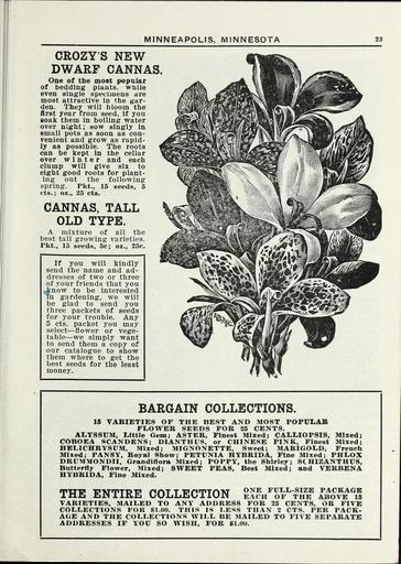 | Keywords: Lippincott seeds (15750730974).jpg MINNEAPOLIS MINNESOTA <br> 23 <br> CROZY'S NEW <br> DWARF CANNAS <br> One of the most popular <br> of bedding plants wbile <br> even single specimens are <br> most attractive In the gar- <br> den They will bloom the <br> first year from seed if you <br> goak them in boiling water <br> over night; sow singly in <br> small pots as soon as con- <br> venient and grow as rapid- <br> ly as possible The roots <br> can be kept in the cellar <br> over winter and each <br> clump will give six to <br> eight good roots for plant- <br> ing out the following <br> spring Pkt 15 seeds 5 <br> cts ; oz 25 cts <br> CANNAS TALL <br> OLD TYPE <br> A mixture of all the <br> best tall growing varieties <br> Pkt 15 seeds 5c; oz 25c <br> If you will kindly <br> send the name and ad- <br> dresses of two or three <br> of your friends that you <br> know to be interested <br> in gardening we will <br> be glad to send you <br> three packets of seeds <br> for your trouble Any <br> 5 cts packet you may <br> select ” flower or vege- <br> table ” we simply want <br> to send them a copy of <br> our catalogue to show <br> them where to get the <br> best seeds for the least <br> money <br> BARGAIN COLLECTIONS <br> 15 VABIETTES OF THE BEST AND MOST POPUIiAB <br> FLOWER SEEDS FOR 25 CENTS <br> AliYSSUM Little Gem; ASTER Finest Mixed; CALLIOPSIS Mixed; <br> COBOEA SCANDENS; DIANTHUS or CHINESE PINK Finest Mixed; <br> HELICHRYSUM Mixed; MIGNONETTE Sweet; MARIGOLD Frencli <br> Mixed; PANSY Royal Show; PETUNIA HYBRIDA Fine Mixed; PHLOX <br> DRUMMONDII Grandiflora Mixed; POPPY the Shirley; SCHIZANTHUS <br> Butterfly Flower Mixed; SWEET PEAS Best Mixed; and VERBENA <br> HYBRIDA Fine Mixed <br> TTTin 'P'KrTT'DTi' r«AT T inr'TTri'Nr full-size package <br> IXlJli l jniiIliJ j UUliJ-iJljUliUri EACH OF THE ABOVE 16 <br> VARIETIES MAILED TO ANY ADDRESS FOR 25 CENTS OR FIVE <br> COLLECTIONS FOR iftl OO THIS IS LESS THAN 2 CTS PER PACK- <br> AGE AND THE COLLECTIONS WILL BE MAILED TO FIVE SEPARATE <br> ADDRESSES IF YOU SO WISH FOR 1 00 42162032 132824 65968 Page 23 Text http //www biodiversitylibrary org/page/42162032 1915 Henry G Gilbert Nursery and Seed Trade Catalog Collection ; Miss C H Lippincott Firm NameFound Calliopsis NameConfirmed Calliopsis EOLID 2748143 NameBankID 4099619 NameFound Coboea scandens NameConfirmed Cobaea scandens EOLID 6359727 NameBankID 1672054 NameFound Dianthus NameConfirmed Dianthus EOLID 11254753 NameBankID 2646562 NameFound Grandiflora NameFound Helichrysum NameConfirmed Helichrysum EOLID 11269353 NameBankID 2576454 NameFound Petunia hybrida NameConfirmed Petunia hybrida EOLID 475923 NameBankID 3882666 NameFound Phlox drummondii NameConfirmed Phlox drummondii EOLID 580874 NameBankID 2653908 NameFound Schizanthus NameConfirmed Schizanthus aff pinnatus Reeves 24 EOLID 11884489 NameFound Verbena hybrida NameConfirmed Verbena hybrida EOLID 481932 NameBankID 2771502 Biodiversity Heritage Library Lippincott seeds 1915 Garden Stories Catalogs Flowers Fruit Nurseries Horticulture Seeds Vegetables U S Department of Agriculture National Agricultural Library bhl page 42162032 dc identifier http //biodiversitylibrary org/page/42162032 bhlGardenStories BHLinbloom nurseries horticulture u s department of agriculture national agricultural library bhlgardenstories bhlinbloom Information field Flickr posted date ISOdate 2015-01-26 Check categories 2015 August 25 CC-BY-2 0 BioDivLibrary https //flickr com/photos/61021753 N02/15750730974 2015-08-25 05 54 03 cc-by-2 0 PD-old-70-1923 Lippincott seeds Photos uploaded from Flickr by Fæ using a script |