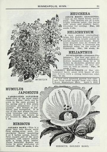 | Keywords: Lippincott seeds (15750961724).jpg MINNEAPOLIS MINN <br> El <br> mSim <br> HTMITLITS <br> HEUCHERA <br> AI UM ROOT SANGUINEA <br> ”One of the finest hardy peren- <br> nials The liowers are of a rich <br> bright crimson color; the leaves <br> light green and slightly hairy <br> Excellent for cutting Pkt 500 <br> seeds 5 cts <br> HELIOHRYSUM <br> A very popular everlasting; <br> large full double flowers of vari- <br> ous colors from bright yellow to <br> scarlet shaded and tipped Hand- <br> some boquets may be formed of <br> them for winter if blossoms are <br> gathered when on the point of <br> expanding Pkt 200 seeds 4c <br> HELIANTHUS <br> SUNFLOWER ” Globosus Fis- <br> tulosus The best and most ef- <br> fective of all annual Sunflowers; <br> flowers immense from 12 to 15 <br> inches in diameter globular and <br> extremely double Of easy cul- <br> ture as well as showy Pkt 40 <br> seeds 5 cts <br> GARDEN HELIOTROPE ” A fine old- <br> fashioned hardy plant with heads of old- <br> rose flowers with a strong heliotrope odor <br> Pkt 10 cts <br> 1 had such splendid garden last sum- <br> mer from seeds bought from you ” Mrs <br> Scott Manistique Mich April 1 1915 <br> HUMULUS <br> JAPONICUS <br> VARIEGATED JAPANESE <br> HOP ” One of the most rapid <br> climbers grown ; seeds can be <br> sown in the open ground in <br> the spring and it will attain <br> enormous dimensions very <br> quickly The foliage is lux- <br> uriant and variegated It is <br> one of the best plants for cov- <br> ering verandas and trellises <br> Heat drouth and insects do <br> not trouble it Pkt 40 seeds <br> 5 cts <br> HIBISCUS <br> GOLDEN BOWL ” This is a <br> plant that will bloom early <br> from spring-sown seed the <br> enormous flower measuring <br> 5 or 6 inches across beauti- <br> fully cupped and of the most <br> exquisite soft canary yellow <br> with a large black center <br> These beautiful flowers are <br> borne in great profusion all <br> summer Pkt 30 seeds 5 cts <br> HIBISCUS GOLDEN BOWL 42205429 132981 65968 Page 21 Text http //www biodiversitylibrary org/page/42205429 1915 Henry G Gilbert Nursery and Seed Trade Catalog Collection ; Miss C H Lippincott Firm NameFound Globosus NameConfirmed Globosus NameBankID 5133566 NameFound Helianthus NameConfirmed Helianthus EOLID 44915 NameBankID 2658016 NameFound Heuchera NameConfirmed Heuchera EOLID 11171380 NameBankID 2649652 NameFound Hibiscus NameConfirmed Hibiscus L EOLID 60741 NameFound Hibiscus golden NameFound Humulus japonicus NameConfirmed Humulus japonicus EOLID 484440 NameBankID 2667515 Biodiversity Heritage Library Lippincott seeds 1916 Garden Stories Catalogs Flowers Fruit Nurseries Horticulture Seeds Vegetables U S Department of Agriculture National Agricultural Library bhl page 42205429 dc identifier http //biodiversitylibrary org/page/42205429 bhlGardenStories BHLinbloom nurseries horticulture u s department of agriculture national agricultural library bhlgardenstories bhlinbloom Information field Flickr posted date ISOdate 2015-01-26 Check categories 2015 August 25 CC-BY-2 0 BioDivLibrary https //flickr com/photos/61021753 N02/15750961724 2015-08-25 05 57 00 cc-by-2 0 PD-old-70-1923 Lippincott seeds Photos uploaded from Flickr by Fæ using a script |
