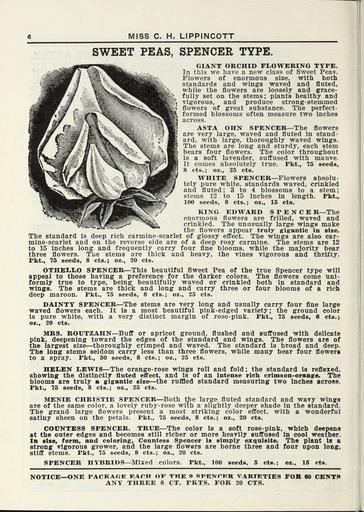 | Keywords: Lippincott seeds (16185761630).jpg  MISS C H LIPPINCOTT <br> SWEET PEAS SPENCER TYPE <br> GIANT ORCHID FLOWERING TYPE <br> In this we have a new class of Sweet Peas <br> Flowers of enormous size with both <br> standards and wings waved and fluted <br> while the flowers are loosely and grace- <br> fully set on the stems; plants healthy and <br> \ vigorous and produce strong-stemmed <br> flowers of great substance The perfect- <br> formed blossoms often measure two inches <br> across <br> ASTA OHN SPENCER  The flowers <br> are very large waved and fluted in stand- <br> ard with large thoroughly waved wings <br> The stems are long and sturdy each stem <br> bears four flowers The color throughout <br> is a soft lavender suffused with mauve <br> It comes absolutely true Pkt 75 seeds <br> 8 cts ; oz 25 cts <br> WHITE SPENCER  Flowers absolu- <br> tely pure white standards waved crinkled <br> and fluted; 3 to 4 blossoms to a stem; <br> stems 12 to 15 inches in length Pkt <br> 100 seeds 8 cts ; oz 15 cts <br> KING EDWARD S P E N C E R  The <br> enormous flowers are frilled waved and <br> crinkled The unusually large wings make <br> the flowers appear truly gigantic in size <br> The standard is deep rich carmine-scarlet of glossy efi'ect The wings are also car- <br> mine-scarlet and on the reverse side are of a deep rosy carmine The stems are 12 <br> to 15 inches long and frequently carry four fine blooms while the majority bear <br> three flowers The stems are thick and heavy the vines vigorous and thrifty <br> Fkt 75 seeds 8 cts ; oz 20 cts <br> OTHELIiO SPENCER  This beautiful Sweet Pea of the true Spencer type will <br> appeal to those having a preference for the darker colors The flowers come uni- <br> formly true to type being beautifully waved or crinkled both in standard and <br> wings The stems are thick and long and carry three or four blooms of a rich <br> deep maroon Pkt 75 seeds 8 cts ; oz 25 cts <br> DAINTY SPENCER  The stems are very long and usually carry four fine large <br> waved flowers each It is a most beautiful pink-edged variety; the ground color <br> is pure white with a very distinct margin of rose-pink Pkt 75 seeds 8 cts ; <br> oz 20 cts <br> MRS ROUTZAHN  Buff or apricot ground flushed and suffused with delicate <br> pink deepening toward the edges of the standard and wings The flowers are of <br> the largest size  thoroughly crimped and waved The standard is broad and deep <br> The long stems seldom carry less than three flowers while many bear four flowers <br> to a spray Pkt 50 seeds 8 cts ; oz 25 cts <br> HELEN liEWIS  The orange-rose wings roll and fold; the standard is reflexed <br> showing the distinctly fluted effect and Is of an intense ricli crimson-orangre The <br> blooms are truly a gigantic size  the ruffled standard measuring two inches across <br> Pkt 75 seeds 8 cts ; oz 25 cts <br> MENIE CHRISTIE SPENCER  Both the large fluted standard and wavy wings <br> are of the same color a lovely ruby-rose with a slightly deeper shade in the standard <br> The grand large flowers present a most striking color effect with a wonderful <br> satiny sheen on the petals Pkt 75 seeds 8 cts ; oz 20 cts <br> COUNTESS SPENCER TRUE  The color Is a soft rose-pink which deepens <br> at the outer edges and becomes still richer or more heavily suffused In cool weather <br> In sice form and coloring Countess Spencer is simply exquisite The plant Is a <br> strong vigorous grower and the large flowers are borne three and four upon long <br> stiff stems Pkt 75 seeds 8 cts ; oz 20 cts <br> SPENCER HYBRIDS  Mixed colors Pkt 100 seeds 6 cts ; oz 15 cts <br> NOTICE  ONE PACKAGE KACTT OT' THE 9 SPENrKR VARIETIES FOB 60 CENTS <br> ANY THREE 8 CT PKTS FOR 20 CTS 42162049 132824 65968 Page 6 Text http //www biodiversitylibrary org/page/42162049 1915 Henry G Gilbert Nursery and Seed Trade Catalog Collection ; Miss C H Lippincott Firm NameFound Orchid Biodiversity Heritage Library Lippincott seeds 1915 Garden Stories Catalogs Flowers Fruit Nurseries Horticulture Seeds Vegetables U S Department of Agriculture National Agricultural Library bhl page 42162049 dc identifier http //biodiversitylibrary org/page/42162049 bhlGardenStories BHLinbloom nurseries horticulture u s department of agriculture national agricultural library bhlgardenstories bhlinbloom Information field Flickr posted date ISOdate 2015-01-26 Check categories 2015 August 25 CC-BY-2 0 BioDivLibrary https //flickr com/photos/61021753 N02/16185761630 2015-08-25 05 56 39 cc-by-2 0 PD-old-70-1923 Lippincott seeds Photos uploaded from Flickr by FĂŚ using a script |