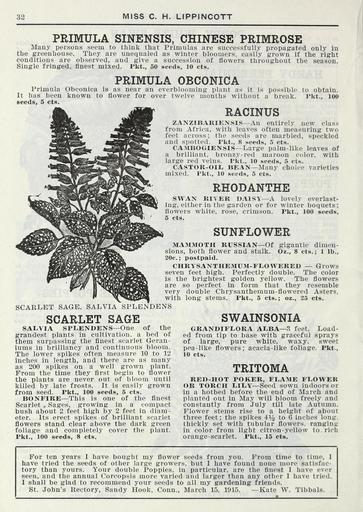 | Keywords: Lippincott seeds (16185787498).jpg 32 <br> MISS C H LIPPiNCOTT <br> PRIMULA SINENSIS CHINESE PRIMROSE <br> Many persons seem to think that Primulas are successfully propagated only iu <br> the greenhouse They are unequaled as winter bloomers easily grown if the right <br> conditions are observed and give a succession of flowers throughout the season <br> Single fringed finest mixed Pkt 50 seeds 10 cts <br> PRIMULA OBCONICA <br> Primula Obconica is as near an everblooming plant as it is possible to obtain <br> It has been known to flower for over twelve months without a break Pkt 100 <br> seeds 5 cts <br> RACINUS <br> ZANZIBARIENSIS An entirely new class <br> from Africa with leaves often measuring two <br> feet across the seeds are marbled speckled <br> and spotted I'kt 8 seeds 5 cts <br> CAMBOGIENSIS Large palm-like leaves of <br> a brilliant bronzy-red maroon color with <br> large red veins Pkt 10 seeds 5 cts <br> CASTOR-OIL BEAN Many choice varieties <br> mixed Pkt 10 seeds 5 cts <br> RHODANTHE <br> SWAN RIVER DAISY A lovely everlast- <br> ing either in the garden or for winter boquets ; <br> flowers white rose crimson Pkt 100 seeds <br> 6 cts <br> SUNFLOWER <br> MAMMOTH RUSSIAN Of gigantic dimen- <br> sions both flower and stalk Oz 8 cts ; 1 lb <br> 20c ; postpaid <br> CHRYSANTHE MUM-FEOWERED Grows <br> seven feet high Perfectly double The color <br> is the brightest golden yellow The flowers <br> are so perfect in form that they resemble <br> very double Chrysanthemum-flowered Asters <br> with long stems Pkt 5 cts ; oz 25 cts <br> SCARLET SAGE SALVIA SPLENDENS <br> SCARLET SAGE <br> SALVIA SPLENDENS One of the <br> grandest plants in cultivation a bed of <br> them surpassing the finest scarlet Geran- <br> iums in brilliancy and continuous bloom <br> The lower spikes often measure 10 to 12 <br> inches in length and there are as many <br> as 200 spikes on a well grown plant <br> From the time they first begin to flower <br> the plants are never out of bloom until <br> killed by late frosts It is easily grown <br> from seed Pkt 100 seeds 5 cts <br> BONFIRE This is one of the finest <br> Scarlet Β» Sages growing in a compact <br> bush about 2 feet high by 2 feet in diam- <br> eter Its erect spikes of brilliant scarlet <br> flowers stand clear above the dark green <br> foliage and completely cover the plant <br> Pkt 100 seeds 8 cts <br> SWAINSONIA <br> GRANDIFLORA ALBA 3 feet Load- <br> ed from tip to base with graceful sprays <br> of large pure white waxy sweet <br> pea-like flowers; acacia-like foliage Pkt <br> 10 cts <br> TRITOMA <br> RED-HOT POKER FLAME FLOWER <br> OR TORCH LILY Seed sown indoors or <br> in a hotbed before the end of March and <br> planted out in May will bloom freely and <br> constantly from July till late Autumn <br> Flower stems rise to a height of about <br> three feet; the spikes 41/2 to G inches long <br> thickly set with tubular flowers ranging <br> in color from light citron-yellow to rich <br> orange-scarlet Pkt 15 cts <br> For ten years I have bought my flower seeds from you From time to time I <br> have tried the seeds of other large growers but I have found none more satisfac- <br> tory than yours Your double Poppies in particular are the finest I have ever <br> seen and the annual Coreopsis more varied and larger than any other I have tried <br> I shall be glad to recommend your seeds to all my gardening friends <br> St John's Rectory Sandy Hook Conn March 15 191 5 Kate W Tibbals <br> ’ 42205440 132981 65968 Page 32 Text http //www biodiversitylibrary org/page/42205440 1915 Henry G Gilbert Nursery and Seed Trade Catalog Collection ; Miss C H Lippincott Firm NameFound Coreopsis NameConfirmed Coreopsis L EOLID 38349 NameFound Primula obconica NameConfirmed Primula obconica EOLID 2892004 NameBankID 5850681 NameFound Primula sinensis NameConfirmed Primula sinensis EOLID 2892062 NameBankID 5850725 NameFound Rhodanthe NameConfirmed Rhodanthe EOLID 2918025 NameBankID 1674221 NameFound Rhodanthe NameConfirmed Rhodanthe EOLID 2918025 NameBankID 4894040 NameFound Salvia splendens NameConfirmed Salvia splendens EOLID 579412 NameBankID 2655330 NameFound Swainsonia grandiflora NameConfirmed Amsonia grandiflora EOLID 581394 NameBankID 2653308 NameFound Tritoma NameConfirmed Tritoma EOLID 35048 NameBankID 4378253 Biodiversity Heritage Library Lippincott seeds 1916 Garden Stories Catalogs Flowers Fruit Nurseries Horticulture Seeds Vegetables U S Department of Agriculture National Agricultural Library bhl page 42205440 dc identifier http //biodiversitylibrary org/page/42205440 bhlGardenStories BHLinbloom nurseries horticulture u s department of agriculture national agricultural library bhlgardenstories bhlinbloom Information field Flickr posted date ISOdate 2015-01-26 Check categories 2015 August 25 CC-BY-2 0 BioDivLibrary https //flickr com/photos/61021753 N02/16185787498 2015-08-25 05 50 46 cc-by-2 0 PD-old-70-1923 Lippincott seeds Photos uploaded from Flickr by FΓ¦ using a script |