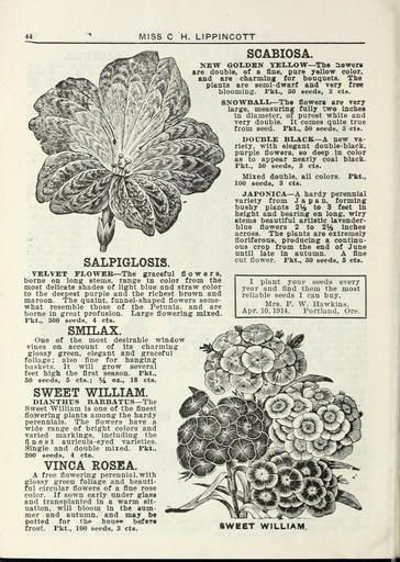 | Keywords: Lippincott seeds (16187018509).jpg  MISS C H LIPPINCOTT <br> SALPIGLOSIS <br> SCABIOSA <br> NEW OOIiDBN YELLOW ” The tiowerg <br> are double of a fine pure yellow color <br> and are charming for bouquets The <br> plants are semi- dwarf and very free <br> blooming Pkt 50 seeds 3 cts <br> SNOWBALL ” The flowerg are very <br> large measuring fully two inches <br> in diameter of purest white and <br> very double It comes quite true <br> from seed Pkt 50 seeds 3 cts <br> DOUBLE BLACK ” A new va- <br> riety with elegant double-black <br> purple flowers so deep in color <br> as to appear nearly coal black <br> Pkt 50 seeds 3 cts <br> Mixed double all colors Pkt <br> 100 seeds 3 cts <br> JAPONICA ” A hardy perennial <br> variety from Japan forming <br> bushy plants 2V to 8 feet in <br> height and bearing on long wiry <br> stems beautiful artistic lavender- <br> blue flowers 2 to 2 inches <br> across The plants are extremely <br> floriferous producing a continu- <br> ous crop from the end of June <br> until late in autumn A fine <br> cut flower Pkt 50 seeds 5 cts <br> VELVET FLOWER ” The graceful flowers <br> borne on long stems range in color from the <br> most delicate shades of light blue and straw color <br> to the deepest purple and the richest brown and <br> maroon The quaint funnel-shaped flowers some- <br> what resemble those of the Petunia and are <br> borne in great profusion <br> Pkt 300 seeds 4 cts <br> Large flowering mixed <br> I plant your seeds every <br> year and find them the most <br> reliable seeds I can buy <br> Mrs F W Hawkins <br> Apr 10 1914 Portland Ore <br> SMILAX <br> One of the most desirable window <br> vines on account of its charming <br> glossy green elegant and graceful <br> foliage; also fine for hanging <br> baskets It will grow several <br> feet high the first season Pkt <br> 50 seeds 5 cts ; 4 oz 18 cts <br> SWEET WILLIAM <br> DIANTHUS BARBATUS ” The <br> Sweet William is one of the finest <br> fiowering plants among the hardy <br> perennials The fiowers have a <br> wide range of bright colors and <br> varied markings including the <br> finest auricula-eyed varieties <br> Single and double mixed Pkt <br> 200 seeds 4 cts <br> VINCA ROSEA <br> A free flowering perennial with <br> f lossy green foliage and beautl- <br> ul circular flowers of a fine rose <br> color If sown early under glass <br> and transplanted in a warm sit- <br> uation will bloom in the sum- <br> mer and autumn and may be <br> potted for the bou «» bef«r« <br> frost Pkt 100 seeds 3 cts <br> 8WEET WILLIAM 42162014 132824 65968 Page 44 Text http //www biodiversitylibrary org/page/42162014 1915 Henry G Gilbert Nursery and Seed Trade Catalog Collection ; Miss C H Lippincott Firm NameFound Dianthus barbatus NameConfirmed Dianthus barbatus EOLID 587229 NameBankID 2646564 NameFound Petunia NameConfirmed Petunia Juss EOLID 60149 NameFound Scabiosa NameConfirmed Scabiosa 'Simon Greaves' EOLID 49101 NameFound Smilax NameConfirmed Smilax Jorge08 EOLID 3396175 NameFound Vinca rosea NameConfirmed Vinca rosea EOLID 581125 NameBankID 2775716 Biodiversity Heritage Library Lippincott seeds 1915 Garden Stories Catalogs Flowers Fruit Nurseries Horticulture Seeds Vegetables U S Department of Agriculture National Agricultural Library bhl page 42162014 dc identifier http //biodiversitylibrary org/page/42162014 bhlGardenStories BHLinbloom nurseries horticulture u s department of agriculture national agricultural library bhlgardenstories bhlinbloom Information field Flickr posted date ISOdate 2015-01-26 Check categories 2015 August 25 CC-BY-2 0 BioDivLibrary https //flickr com/photos/61021753 N02/16187018509 2015-08-25 05 51 01 cc-by-2 0 PD-old-70-1923 Lippincott seeds Photos uploaded from Flickr by Fæ using a script |