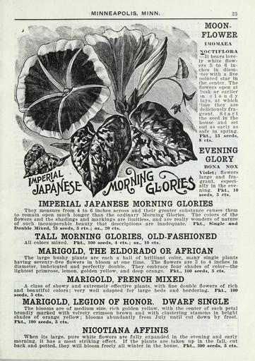 | Keywords: Lippincott seeds (16187190829).jpg  s are inadequate Pkt Single and <br> Double Mixed 75 seeds 5 cts ; oz 20 cts <br> TALL MORNING GLORIES OLD-FASHIONED <br> All colors mixed Pkt 100 seeds 4 cts ; oz 10 cts <br> MARIGOLD THE ELDORADO OR AFRICAN <br> The large bushy plants are each a ball of brilliant color many single plants <br> having seventy-five flowers in bloom at one time The flowers are 3 to 4 inches In <br> diameter imbricated and perfectly double They embrace four shades of color ” the <br> lightest primrose lemon golden yellow and deep orange Pkt 100 seeds 5 cts <br> MARIGOLD FRENCH MIXED <br> A class of showy and extremely effective plants with fine double flowers of rich <br> and beautiful colors; very well adapted for large beds and bordering Pkt 100 <br> ' marigold legion of honor dwarf single <br> The blooms are of medium size rich golden yellow with the center of each petal <br> broadly marked with velvety crimson brown and with clustering stamens in bright <br> shades of orange yellow; blooms abundantly from July until cut down by frost <br> Pkt 100 seeds 5 cts <br> NICOTIANA AFFINIS <br> When its large pure white flowers are fully expanded in the evening and early <br> morning it has a most striking effect If the plants are taken up in the fall cut <br> back and potted they will bloom freely all winter in the house Pkt 300 seeds 5 cts 42205433 132981 65968 Page 25 Text http //www biodiversitylibrary org/page/42205433 1915 Henry G Gilbert Nursery and Seed Trade Catalog Collection ; Miss C H Lippincott Firm NameFound Bona nox NameFound Nicotiana affinis NameConfirmed Nicotiana affinis T Moore EOLID 486699 NameBankID 618477 Biodiversity Heritage Library Lippincott seeds 1916 Garden Stories Catalogs Flowers Fruit Nurseries Horticulture Seeds Vegetables U S Department of Agriculture National Agricultural Library bhl page 42205433 dc identifier http //biodiversitylibrary org/page/42205433 bhlGardenStories BHLinbloom nurseries horticulture u s department of agriculture national agricultural library bhlgardenstories bhlinbloom Information field Flickr posted date ISOdate 2015-01-26 Check categories 2015 August 25 CC-BY-2 0 BioDivLibrary https //flickr com/photos/61021753 N02/16187190829 2015-08-25 05 51 28 cc-by-2 0 PD-old-70-1923 Lippincott seeds Photos uploaded from Flickr by Fæ using a script |