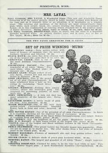 | Keywords: Lippincott seeds (16187222039).jpg MINNEAPOLIS MINN <br> 59 <br> MRS LAYAL <br> Pansy Geranium MRS LAYAL A Wonderful Plant This new and Avonderful Pansy <br> Geranium is of the easiest growth dwarf in habit literally covered with flowers all <br> the time and as it requires little or no attention it is invaluable as a windoAV <br> plant The coloring and markings of the flowers are most extraordinary light <br> pink white dark purple black etc almost rivaling the Pansy in uniqueness of <br> flower It is this combination of coloring which obtained for it the popular name <br> of Pansy Geranium Strong plants ready to bloom 20 cts each; three for 50 cts <br> New Pansy Geranium BRIDESMAID Same as above but the color is a beautiful <br> lavender bordered white An entirely distinct color and in every way as fine as <br> Mrs Layal 20 cts ; three for 50 cts <br> THE TWO PANSY GERANIUMS FOR 35 CENTS <br> SET OF PRIZE WINNING 1VIUMS ' <br> AUSTRALIAN GOLD Deep golden-yellow <br> tones of bronze; of immense size; the peta <br> feathery incurved and whorled 15 cts <br> BLACK HAWK An extra fine deep crimson <br> etv of the largest size; none finer of its colo <br> CHRISTMAS CHEER This is one of <br> the most brilliant Chrysanthemums <br> 20 cts <br> CLEMENTINE TOUSET The most <br> wonderful of all white Mums Pure <br> snow-white often flushed pink ; of <br> immense size 15 cts <br> GOLDEN GLOW Bright yellow of vel- <br> vety finish Flower five and one-half <br> inches in diameter 10 cts <br> GOOD GRACIOUS This is the grand- <br> est of all pink Chrysanthemums Its <br> name originated from a lady on first <br> seeing it exclaiming Good Graci- <br> ous 20 cts <br> GOLDEN WEDDING Nothing finer amon <br> yellows; shines like burnished gold Thi <br> standard for measuring yellows ; of mam <br> moth size 15 cts <br> JOHN SHRIMPTON A rich red that has <br> many admirers ; of the largest size Extra <br> 15 cts <br> LAVENDER QUEEN A lovely shade of pink- <br> ish-lilac Very desirable 15 cts <br> MAJOR BON YFFON One of the very deep <br> golden-yellow Chrysanthemums; beautiful <br> flower both in form and color ; incurved 15 <br> cts <br> MISS 3IINNIE BAILEY One of the grandest of all pink Chrysanthemums <br> it IS exquisite showing not the slightest trace of coarseness 10 cts <br> MRS JEROME JONES One of the finest white Chrysanthemums ever raised ; flowers <br> of exquisite form and finish; grand 10 cts <br> MRS PERRIN Still the brightest of all the pinks Beautifullv formed 10 cts <br> MRS O P BASSET A light lemon-yellow of the largest size; grand 10 cts <br> NAGOYA One of the largest and finest brilliant yellows in the whole Chrysanthe- <br> mum family 15 cts <br> PERCY PLUMRIDGE This grand variety has literally leaped into popularity Flow- <br> ers are so large as to startle you The color shades from a few rows of lavender <br> pearl to the richest pink 15 cts <br> ROBERT HALLIDAY Flowers of mammoth size and deep golden-yellow; reallv a <br> wonder 10 cts <br> SILVER CLOUD A delicate shade of peach-pink bordered white 10 cts <br> TIMOTHY EATON The largest and grandest of all white Mums ; simplv immense <br> 10 cts <br> VIRGINIA POEHLMAN Claimed by many to be the very best white to date Pure <br> white faintly tinged pink A most wonderfully beautiful Chrysanthemum 20 cts <br> CHYSAMilEMUMS <br> In finish 42205467 132981 65968 Page 59 Text http //www biodiversitylibrary org/page/42205467 1915 Henry G Gilbert Nursery and Seed Trade Catalog Collection ; Miss C H Lippincott Firm NameFound Chrysanthemum NameConfirmed Chrysanthemum EOLID 38388 NameBankID 2657422 Biodiversity Heritage Library Lippincott seeds 1916 Garden Stories Catalogs Flowers Fruit Nurseries Horticulture Seeds Vegetables U S Department of Agriculture National Agricultural Library bhl page 42205467 dc identifier http //biodiversitylibrary org/page/42205467 bhlGardenStories BHLinbloom nurseries horticulture u s department of agriculture national agricultural library bhlgardenstories bhlinbloom Information field Flickr posted date ISOdate 2015-01-26 Check categories 2015 August 25 CC-BY-2 0 BioDivLibrary https //flickr com/photos/61021753 N02/16187222039 2015-08-25 05 50 39 cc-by-2 0 PD-old-70-1923 Lippincott seeds Photos uploaded from Flickr by FĂŚ using a script |