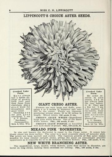 | Keywords: Lippincott seeds (16187259257).jpg MISS C H LIPPINCOTT <br> LIPPINCOTT'S CHOICE ASTER SEEDS <br> Have always <br> had a better av- <br> erage of growth <br> from your seed <br> than those from <br> elsewhere Also a <br> good word for <br> promptness and <br> good count <br> Thanking you <br> for past good <br> treatment I am <br> A V Drown <br> Gardener <br> Oconomowoc <br> Mch 6 1914 Wis <br> GIANT CREGO ASTER <br> ˘ Flowers are very large and fluffy aver- <br> aging 4 to 6 inches in diameter and very <br> full to the center Plants are vigorous <br> producing strong stems 20 to 30 inches in <br> length Mixed colors 150 seeds 8 cts <br> CREGO'S GIANT WHITE ” Magnificent <br> large pure white flowers One of the finest <br> white Asters Pkt 150 seeds 8 cts <br> CREGO'S GIANT PURPLE ” A beautiful <br> rich dark shade of purple Pkt 150 seeds 8c <br> My order re- <br> ceived in due <br> season and as <br> has always been <br> the case before <br> O K They are <br> a fine lot I am <br> very positive of <br> the results Your <br> seeds and busi- <br> ness methods <br> have always <br> pleased us <br> A V Drown <br> Oconomowoc <br> Mch 13 '14 Wis <br> MIKADO PINK ROCHESTER/' <br> In size and beauty the Rochester is equal to the Crego Aster It comes into <br> bloom about ten days earlier The color is a most exquisite shade of lavender pink <br> The petals are long narrow and curled The vigorous growth of this aster makes <br> possible its long slender upright stems giving the plant an exceedingly graceful <br> appearance as it supports its 15 to 20 immense feathery flowers Pkt 150 seeds 8 cts <br> NEW WHITE BRANCHING ASTER <br> The magnificent large double white flowers quite four inches in diameter are <br> borne on long stems making them excellent for cutting Pkt 150 seeds 6 cts 42162053 132824 65968 Page 2 Text http //www biodiversitylibrary org/page/42162053 1915 Henry G Gilbert Nursery and Seed Trade Catalog Collection ; Miss C H Lippincott Firm Biodiversity Heritage Library Lippincott seeds 1915 Garden Stories Catalogs Flowers Fruit Nurseries Horticulture Seeds Vegetables U S Department of Agriculture National Agricultural Library bhl page 42162053 dc identifier http //biodiversitylibrary org/page/42162053 bhlGardenStories BHLinbloom nurseries horticulture u s department of agriculture national agricultural library bhlgardenstories bhlinbloom Information field Flickr posted date ISOdate 2015-01-26 Check categories 2015 August 25 CC-BY-2 0 BioDivLibrary https //flickr com/photos/61021753 N02/16187259257 2015-08-25 06 50 44 cc-by-2 0 PD-old-70-1923 Lippincott seeds Photos uploaded from Flickr by Fæ using a script |