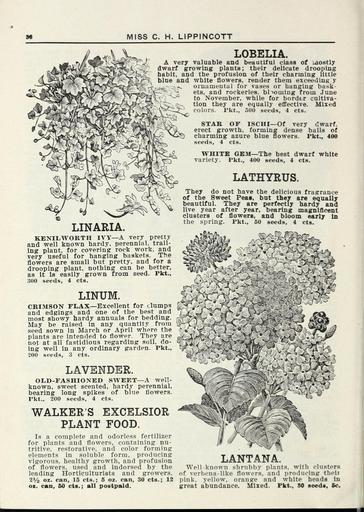 | Keywords: Lippincott seeds (16371471551).jpg MISS C H LIPPINCOTT <br> LINARIA <br> KENILWORTH IVY A very pretty <br> and well known hardy perennial trail- <br> ing plant for covering rock work and <br> very useful for hanging baskets The <br> flowers are small but pretty and for a <br> drooping plant nothing can be better <br> as it is easily grown from seed Pkt <br> 300 seeds 4 cts <br> LINUM <br> CRIMSON FLiAX Excellent for clumps <br> and edgings and one of the best and <br> most showy hardy annuals for bedding <br> May be raised in any quantity from <br> seed sown in March or April where the <br> plants are intended to flower They are <br> not at all fastidious regarding soil do- <br> ing well in any ordinary garden Pkt <br> 200 seeds 3 cts <br> LAVENDER <br> OLD-FASHIONED SWEET A well- <br> known sweet scented hardy perennial <br> bearing long spikes of bine flowers <br> Pkt 200 seeds 4 cts <br> WALKER'S EXCELSIOR <br> PLANT FOOD <br> Is a complete and odorless fertilizer <br> for plants and flowers containing nu- <br> tritive restorative and color forming <br> elements in soluble form producing <br> vigorous healthy growth and profusion <br> of flowers used and indorsed by the <br> leading Horticulturists and growers <br> 2 oz can 15 cts ; 6 oz can 30 cts ; 12 <br> oi cftn 60 cts ; all postpaid <br> LOBELIA <br> A very valuable and beautiful class of luostly <br> dwarf growing plants ; their delicate drooping <br> habit and the profusion of their charming little <br> blue and white flowers render them exceeding y <br> ornamental for vases or hanging bask- <br> ets and rockeries blooming from June <br> to November while for border cultiva- <br> -- tion they are equally effective Mixed <br> \ ~ colors Pkt 500 seeds 4 cts <br> STAB OF ISCHI Of very dwarf <br> erect growth forming dense balls of <br> charming azure blue flowers Pkt 400 <br> seeds 4 cts <br> WHITE GEM The best dwarf white <br> variety Pkt 400 seeds 4 cts <br> LATHYRUS <br> They do not have the delicious frasrrance <br> of the Sweet Peas but they are equally <br> beautiful They are perfectly hardy and <br> live year after year bearing magnificent <br> clusters of flowers and bloom early in <br> the spring Pkt 50 seeds 4 cts <br> TCJA/i-- <br> f <br> U4fv / \S f 'ki J v V <br> h <br> LANTANA ' <br> Well-known shrubby plants with clusters <br> of verbena-like flowers and producing theii <br> pink yellow orange and white heads in <br> great abundance Mixed Pkt 80 seeds 6c 42162006 132824 65968 Page 36 Text http //www biodiversitylibrary org/page/42162006 1915 Henry G Gilbert Nursery and Seed Trade Catalog Collection ; Miss C H Lippincott Firm NameFound Lantana NameConfirmed Lantana L EOLID 37682 NameBankID 459108 NameFound Lathyrus NameConfirmed Lathyrus EOLID 11223610 NameBankID 3874249 NameFound Linaria NameConfirmed Linaria EOLID 44927 NameBankID 2655665 NameFound Linum NameConfirmed Linum EOLID 11210876 NameBankID 2652543 NameFound Lobelia NameConfirmed Lobelia sect Rhynchopetalum Fresenius Benth EOLID 2895791 Biodiversity Heritage Library Lippincott seeds 1915 Garden Stories Catalogs Flowers Fruit Nurseries Horticulture Seeds Vegetables U S Department of Agriculture National Agricultural Library bhl page 42162006 dc identifier http //biodiversitylibrary org/page/42162006 bhlGardenStories BHLinbloom nurseries horticulture u s department of agriculture national agricultural library bhlgardenstories bhlinbloom Information field Flickr posted date ISOdate 2015-01-26 Check categories 2015 August 25 CC-BY-2 0 BioDivLibrary https //flickr com/photos/61021753 N02/16371471551 2015-08-25 05 53 45 cc-by-2 0 PD-old-70-1923 Lippincott seeds Photos uploaded from Flickr by FĂŚ using a script |