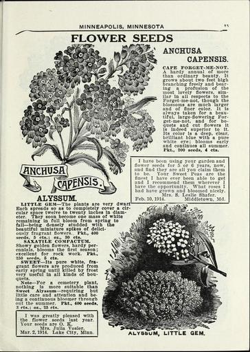 | Keywords: Lippincott seeds (16372266522).jpg MINNEAPOLIS MINNESOTA <br> FLOWER SEEDS <br> ANCHUSA <br> CAPENSIS <br> CAPE FORGET-ME-NOT <br> A hardy annual of more <br> than ordinary beauty It <br> grows about two feet high <br> branching freely and bear- <br> ing a profusion of the <br> most lovely flowers sim- <br> ilar in all respects to the <br> Forget-me-not though the <br> blossoms are much larger <br> and of finer color It is <br> always taken for a beau- <br> tiful large-flowering For- <br> get-me-not and for bo- <br> quets and cut flowers it <br> is indeed superior to it <br> Its color is a deep clear <br> brilliant blue with a pure <br> white eye blooms early <br> and continues all summer <br> Pkt 200 seeds 4 cts <br> ALYSSUM <br> LITTLE GEM The plants are very dwarf <br> Each spreads so as to completely cover a cir- <br> cular space twelve to twenty inches in diam- <br> eter They soon become one mass of white <br> remaining in full bloom from spring to <br> fall being densely studded with the <br> beautiful miniature spikes of dellci- <br> ously fragrant flowers Pkt 400 <br> seeds 5 cts ; oz 30 cts <br> SAXATILE COMPACTUM <br> Showy golden flowers hardy per- <br> ennials blooms the first season; <br> excellent for rock work Pkt <br> 250 seeds 6 cts <br> SWEET Its pure white fra- <br> grant flowers are produced from <br> early spring until killed by frost <br> very useful in all kinds of bou- <br> quets <br> Note For a cemetery plant <br> nothing is more suitable than <br> Sweet Alyssum requiring but <br> little care and attention and be- <br> ing a continuous bloomer through <br> out the summer Pkt 400 seeds <br> 3 cts ; oz 25 cts <br> I have been using your garden and <br> flower seeds for 5 or 6 years now <br> and find they are all you claim them <br> to be Your Sweet Peas are the <br> finest I have ever been able to get <br> and I recommend them wherever I <br> have the opportiinity What roses I <br> had have grown and bloomed nicely <br> Mrs S Leslie Shafer <br> Feb 10 1914 Middletown Md <br> I <br> was greatly pleased <br> with <br> the <br> flower <br> seeds <br> last <br> year <br> Your seeds <br> are O <br> K <br> Mrs <br> lulia <br> Vosler 1 <br> Mar <br> 2 1914 <br> Lake City <br> Minn 1 <br> ALYSbUM LITTLE GEM 42162040 132824 65968 Page 15 Text http //www biodiversitylibrary org/page/42162040 1915 Henry G Gilbert Nursery and Seed Trade Catalog Collection ; Miss C H Lippincott Firm NameFound Alyssum NameConfirmed Alyssum L EOLID 39058 NameFound Anchusa capensis NameConfirmed Anchusa capensis EOLID 596328 NameBankID 2663402 NameFound Compactum NameConfirmed Compactum NameBankID 4455517 Biodiversity Heritage Library Lippincott seeds 1915 Garden Stories Catalogs Flowers Fruit Nurseries Horticulture Seeds Vegetables U S Department of Agriculture National Agricultural Library bhl page 42162040 dc identifier http //biodiversitylibrary org/page/42162040 bhlGardenStories BHLinbloom nurseries horticulture u s department of agriculture national agricultural library bhlgardenstories bhlinbloom Information field Flickr posted date ISOdate 2015-01-26 Check categories 2015 August 25 CC-BY-2 0 BioDivLibrary https //flickr com/photos/61021753 N02/16372266522 2015-08-25 05 50 18 cc-by-2 0 PD-old-70-1923 Lippincott seeds Photos uploaded from Flickr by FĂŚ using a script |