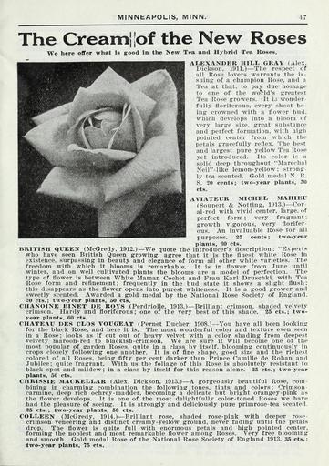 | Keywords: Lippincott seeds (16372553622).jpg Experts <br> who have seen British Queen growing agree that it is the finest white Rose in <br> existence surpassing in beauty and elegance of form all other white varieties The <br> freedom with which it blooms is remarkable It is in flower from June until <br> winter and on well cultivated plants the blooms are a model of perfection The <br> type of flower is between White Maman Cochet and Frau Karl Druschki with Tea <br> Rose form and refinement ; frequently in the bud state it shows a slight flush ; <br> this disappears as the flower opens into purest whiteness It is a good grower and <br> sweetly scented Awarded a gold medal by the National Rose Society of England <br> 20 cts ; two-year plants 50 cts <br> CHANOINE BINET DE ROYS Perdriolle 1913 Brilliant crimson shaded velvety <br> crimson Hardy and floriferous; one of the very best of this shade 25 cts ; two- <br> year plants 60 cts <br> CHATEAU DES CLOS VOUGEAT Pernet Ducher 1908 You have all been looking <br> for the black Rose and here it is The most wonderful color and texture even seen <br> in a Rose; looks as if cut out of heavy velvet with a color shading from deepest <br> velvety maroon- red to blackish-crimson We are sure it will become one of the <br> most popular of garden Roses quite in a class by itself blooming continuously in <br> crops closely following one another It is of fine shape good size and the richest <br> colored of all Roses being fifty per cent darker than Prince Camille de Rohan and <br> Jubilee; quite fragrant With us the foliage of this Rose is absolutely resistant to <br> black spot and mildew; in a class by itself for this reason alone 25 cts ; two-year <br> plants 50 cts <br> CHRISSIE iMACKELLAR Alex Dickson 1913 A gorgeously beautiful Rose com- <br> bining in charming combination the following tones tints and colors; Crimson- <br> carmine deep rich ochrey-madder becoming a delicate but bright orangey-pink as <br> the flower develops It is one of the most delightfully color-toned Roses we have <br> had the pleasure of seeing It is strongly and deliciously pure primrose-tea scented <br> 25 cts ; two-year plants 50 cts <br> COLLEEN McGredy 1914 Brilliant rose shaded rose-pink with deeper rose- <br> crimson veneering and distinct creamy-yellow ground never fading until the petals <br> drop The flower is quite full with enormous petals and high pointed center <br> forming the noblest and most remarkable flower among Roses Very free blooming <br> and smooth Gold medal Rose of the National Rose Society of England 1913 35 cts ; <br> two-year plants 75 cts 42205455 132981 65968 Page 47 Text http //www biodiversitylibrary org/page/42205455 1915 Henry G Gilbert Nursery and Seed Trade Catalog Collection ; Miss C H Lippincott Firm Biodiversity Heritage Library Lippincott seeds 1916 Garden Stories Catalogs Flowers Fruit Nurseries Horticulture Seeds Vegetables U S Department of Agriculture National Agricultural Library bhl page 42205455 dc identifier http //biodiversitylibrary org/page/42205455 bhlGardenStories BHLinbloom nurseries horticulture u s department of agriculture national agricultural library bhlgardenstories bhlinbloom Information field Flickr posted date ISOdate 2015-01-26 Check categories 2015 August 25 CC-BY-2 0 BioDivLibrary https //flickr com/photos/61021753 N02/16372553622 2015-08-25 05 50 32 cc-by-2 0 PD-old-70-1923 Lippincott seeds Photos uploaded from Flickr by FĂŚ using a script |